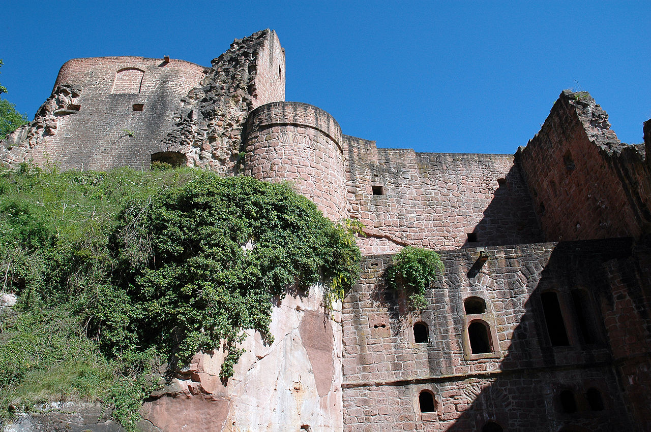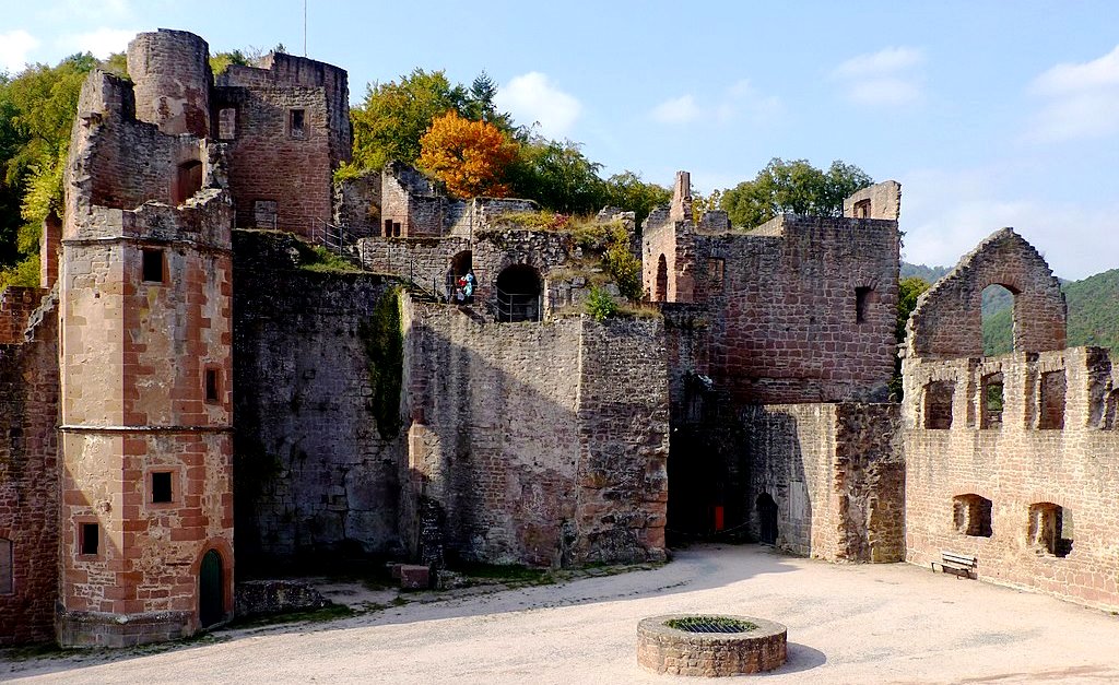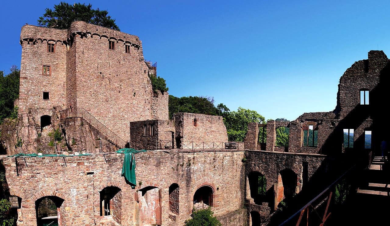 A vaulted ceiling cellar and some other rooms are most of what remains of the living quarters of the castle.  A distinctive feature of the castle is the great broad formal terrace of the former residence over-looking the wooded canyon of the Eisenach.  It is located 30 minutes from Kaiserslautern.  There is a road leading to a parking area near the ruin, and a hiking trail leads up from the village below from the parking lot of the modern town hall.  The approach to the castle is fairly unique as the walking trail leads through a tunnel under the walls and along the slope above the river road below.  The castle is open daily with a nominal admission charge.  (Alexander Thon, ed. (2005), Wie Schwalbennester an den Felsen geklebt : Burgen in der Nordpfalz (in German) (1. ed.), Regensburg: Verlag Schnell und Steiner)