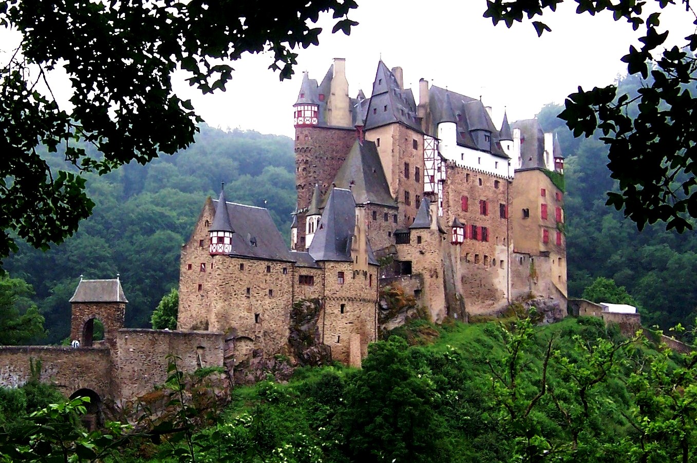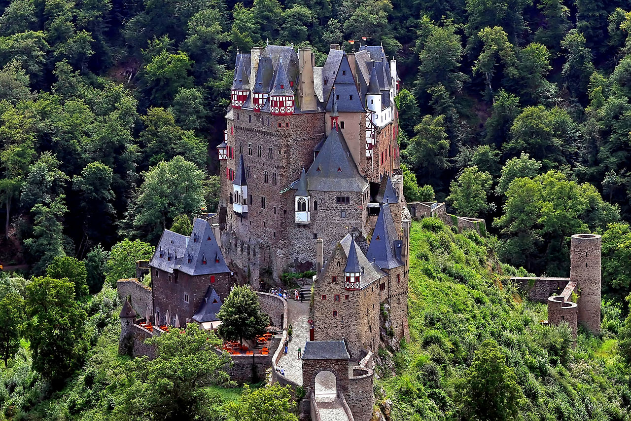 Eltz Castle (Burg Eltz) is a medieval castle nestled in the hills above the Moselle River between Koblenz and Trier. It is still owned by a branch of the same family (the Eltz family) that lived there in the 12th century, 33 generations ago.  Bürresheim Castle, Eltz Castle and Lissingen Castle are the only castles on the left bank of the Rhine in Rhineland-Palatinate which have never been destroyed.