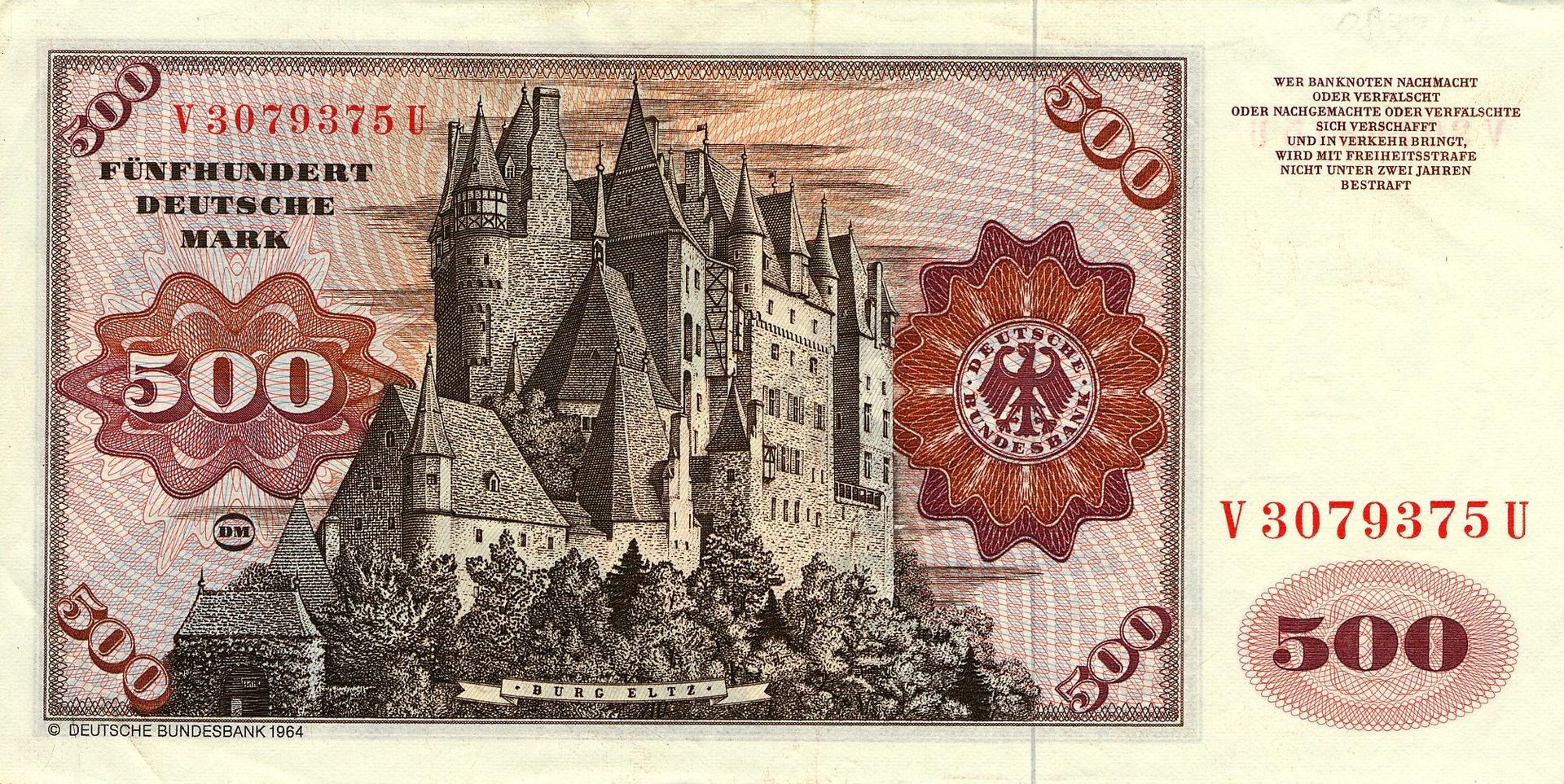 From 1965 to 1992, an engraving of Eltz Castle was used on the German 500 Deutsche Mark note. (de Fabianis, Valeria, ed. (2013). Castles of the World. New York: Metro Books)