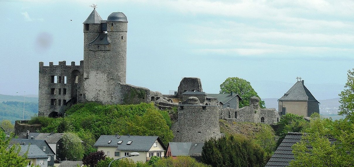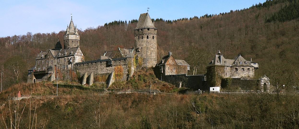 Mayen: Schloss Bürresheim is a medieval northwest of Mayen, Rheinland-Pfalz, Germany.  It is built on rock in the Eifel mountains above the Nette.  Bürresheim Castle, Eltz Castle and Lissingen Castle are the only castles on the left bank of the Rhine in Rhineland-Palatinate which have never been destroyed.  It was inhabited until 1921 and is now a museum operated by the General Directorate for Cultural Heritage, Rhineland-Palatinate.