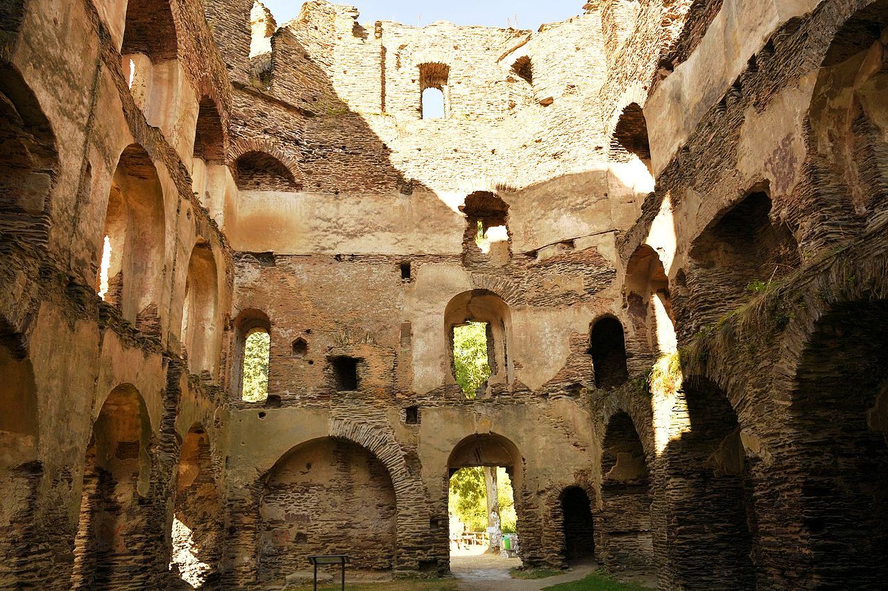 The most important component is the Bernhard Building (around 1400), whose column on the ground floor with a coat of arms carried by angels once supported the mighty vault.  In its heyday, the castle had 100 rooms.  In the same century, Margrave Christoph I expanded the New Castle, which was begun in 1370, in the city of Baden and moved the residence there in 1479. The old castle then served as a widow’s residence, but in 1599 it was destroyed by fire.  The ruins were not structurally secured until after 1830.  It was later looked after by the State Palaces and Gardens of Baden-Württemberg.