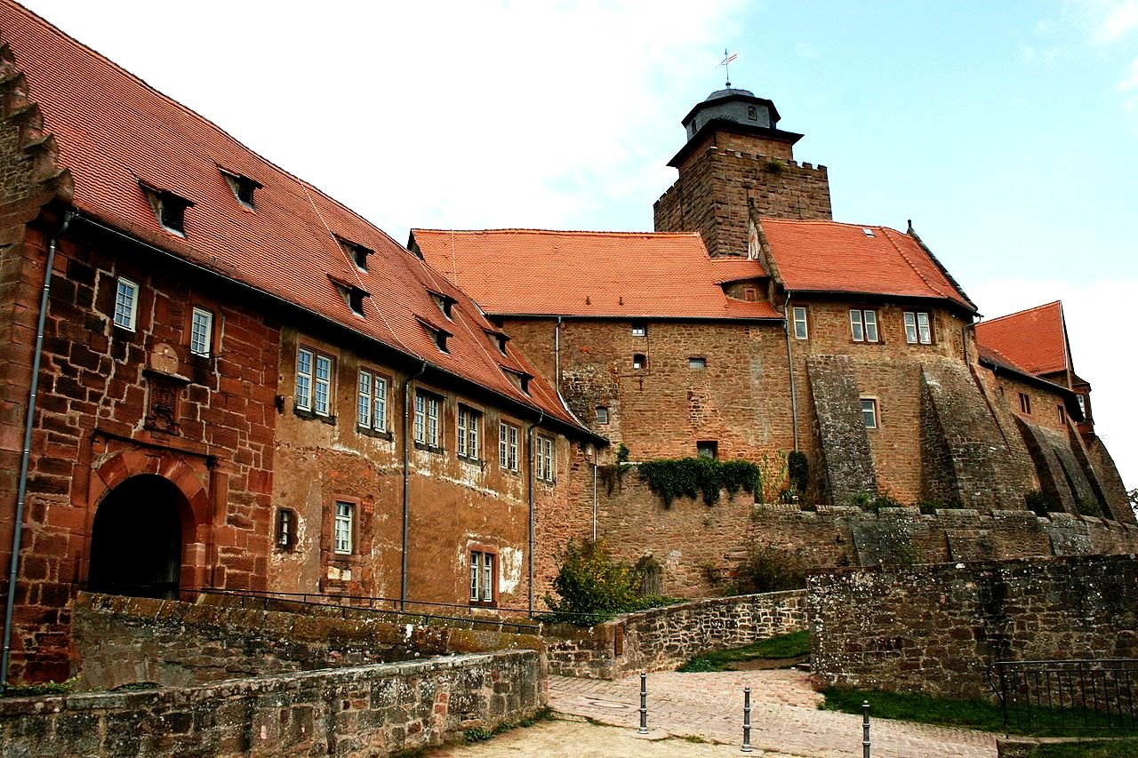 Burg Breuberg, also called Kernburg (core castle) was probably founded around or shortly after 1200 by the imperial abbey of Fulda under Abbot Markwald I, to secure Fulden properties in the Odenwald.  It is one of Germany’s best preserved castles.   c1200 the bailiwick was taken over by the Lords of Lützelbach, who then called themselves Lords (Herren von) of Breuberg.  Only the keep and the late Romanesque portal of the main castle can be dated to the earliest construction phase of the castle.  Residential buildings from this time have not survived, although individual walls from earlier buildings could be built in the buildings of the core castle.