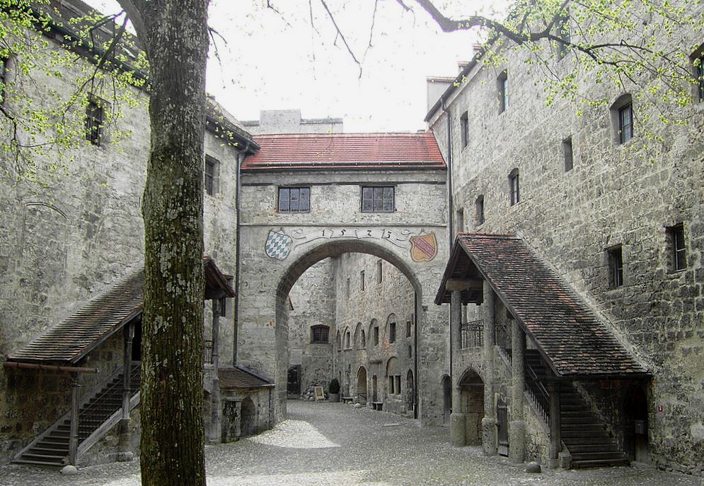 The Gothic castle comprises the main castle with the inner courtyard and five outer courtyards.  The outermost point of the main castle is the Palas with the ducal private rooms.  Today it houses the castle museum, including late Gothic paintings of the Bavarian State Picture Collection.  On the town side of the main castle next to the donjon are the gothic inner Chapel of St. Elizabeth (1255) and the Dürnitz (knights’ hall) with its two vaulted halls. Opposite the Dürnitz are the wings of the Duchess’ residence. The first outer courtyard protected the main castle and also included the stables, the brewery and the bakery.  The second courtyard houses the large Arsenal building (1420) and the gunsmith’s tower.  This yard is protected by the dominant Saint George’s Gate (1494).  The Grain Tower and the Grain Measure Tower were used for stabling and to store animal food; they belong to the third courtyard.  The main sight of the fourth courtyard is the late Gothic outer Chapel of St. Hedwig (1479–1489).  The court officials and craftsmen worked and lived in the fifth courtyard, which was once protected by a strong fortification.  In 1800 this fortification was destroyed by the French under Michel Ney.  The Pulverturm (“Powder Tower”, constructed before 1533) protected the castle in the western valley next to the Wöhrsee lake, an old backwater of the river.  A battlement connects this tower with the main castle.