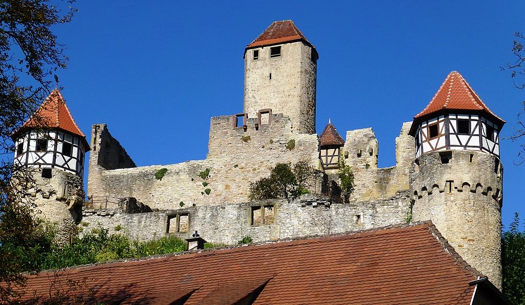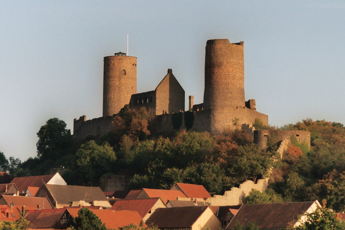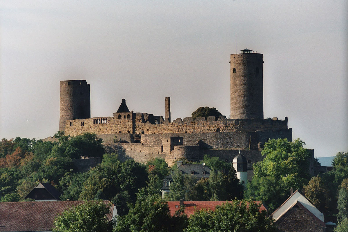 Münzenberg: Burg Münzenberg is a ruined hill castle in the Wetteraukreis, Hesse. It dates from the 12th century, and is one of the best preserved castles from the High Middle Ages in Germany. The first lord of nearby Arnsburg, Kuno von Arnsburg, served Emperor Heinrich IV as a Ministerialis in 1057. c1064 he married Gräfin Mathilde of the House of Bilstein. Their daughter, Gertrud (b. c1065, d. before 1093) married Eberhard von Hagen (1075-1122), lord of Burg Hayn near Frankfurt, who moved his seat to Arnsburg and changed his name to “von Hagen und Arnsburg”. Under Eberhard’s son, Konrad I (1093-1130) the family became the most powerful in the Wetterau and the Rhine-Main region. Konrad II exchanged properties with Fulda Abbey, receiving the land around Münzenberg Castle. His son, Kuno I (1151-1207), from 1156 styled himself von Münzenberg, implying that by then a castle had been built at Münzenberg and the earlier one at Arnsburg had been vacated.