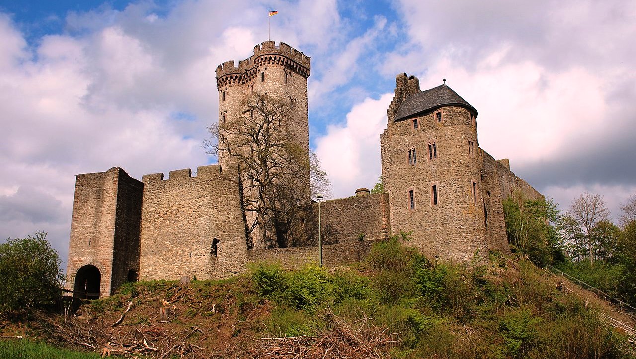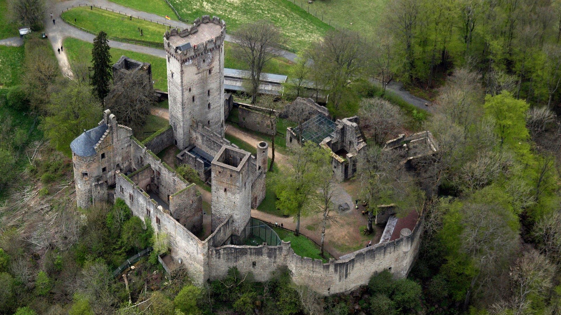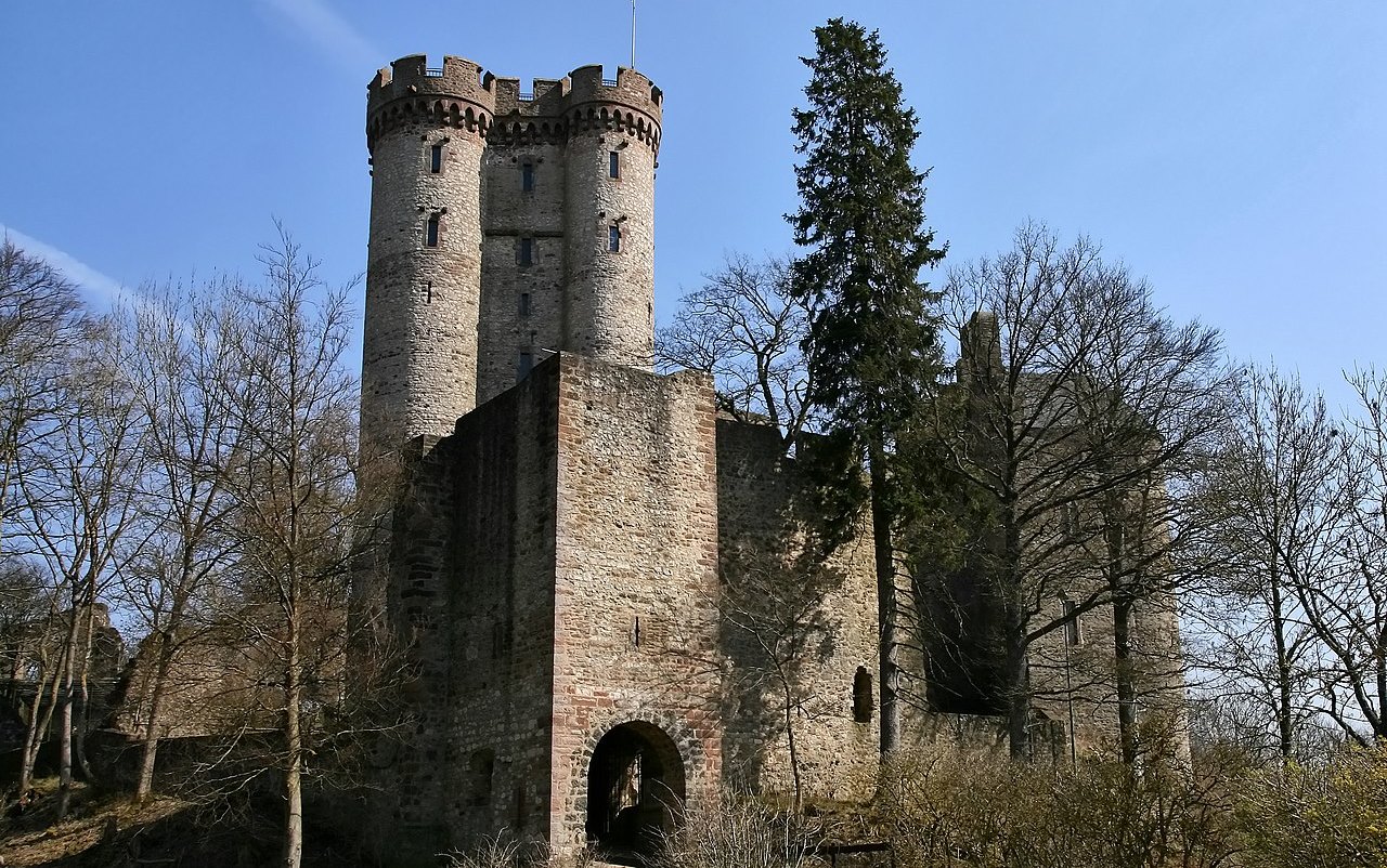 There is a legend that King Clovis came (c4th to 5th Century) to this castle site and a virgin appeared who convinced him to become a Christian. After he became one, he founded a castle there, although none of this is documented. The oldest building remains on the castle hill from an older settlement date from the 10th or 11th century. The oldest parts of the inner castle, the so-called herringbone masonry, dates to the first half of the 12th century. The Nürings, who died out in 1172, were the possible builders. After the end of the Staufer period, the castle underwent an energetic expansion under the Falkensteiners. The lower floors of the keep date from the first decades of the 14th century. It has been raised several times over the years and is now 34 meters high. The castle served, especially from the beginning of the 14th century, to protect the important trade route between Frankfurt and Cologne.
