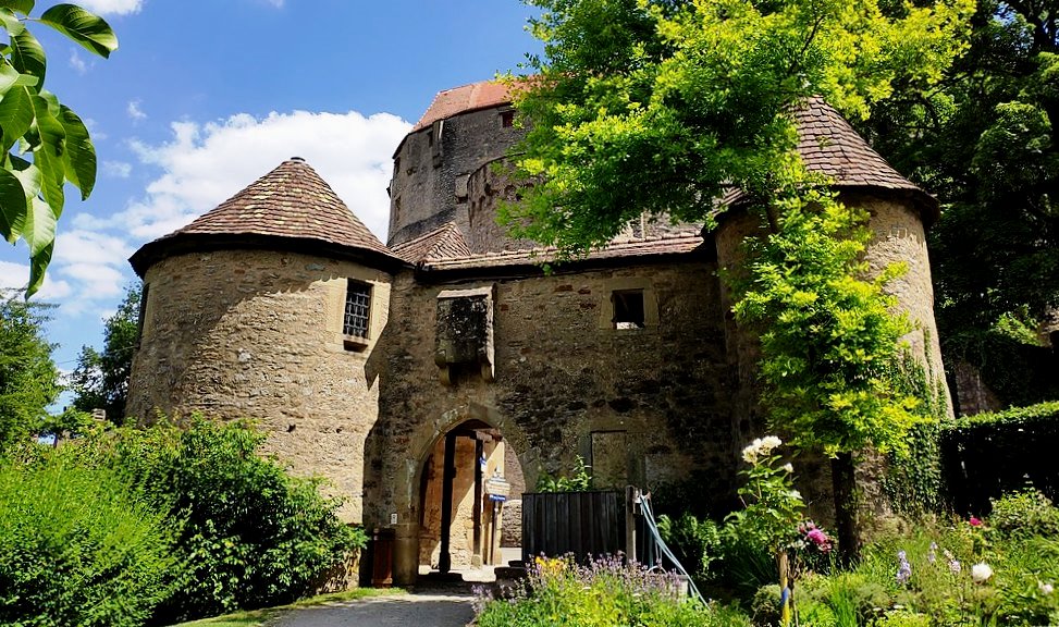 On the street leading west of the castle through the outer bailey, there are buildings dating from the 15th to 17th centuries. The long, two-story quarry stone building from the 15th century is the main structure. The adjoining low, partly timber-framed building directs the view to the gate with the two towers, the entrance gate to the outer bailey in the old days. The path still leads past the castle chapel into the valley. The pointed arch, by a secured gate dates from the 2nd half of the 15th century and was closed by two wooden rotating leaves. The second gate opposite, through which one can visit the castle today, also had its rotating wing on the side facing the outer bailey. The outer bailey behind its wall was therefore lockable and did not serve to protect the inner bailey. The wall surrounding the outer bailey was only opened in modern times because of the driveway on both sides.