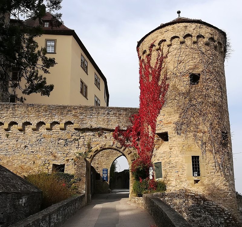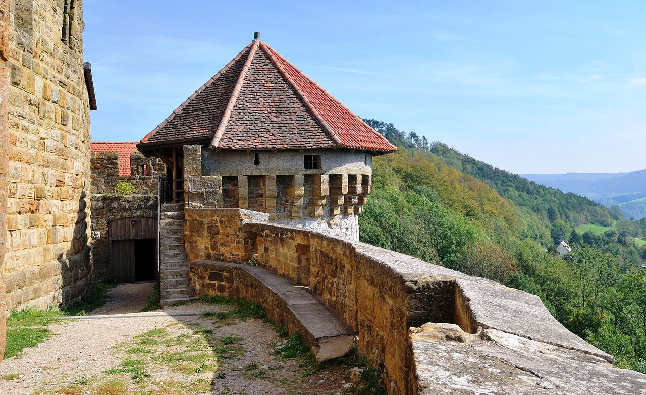 On the way to the main gate of the castle, the mighty shield wall and the 40 m high keep, are impressive. They are located behind the Zwingermauer with a late Gothic round arch frieze that surrounds the entire inner castle. The older wall probably from the 13th century. It was built with five round towers in the 2nd half of the 15th century, under the Lords of Gemmingen. The shield wall is made of quarry stone masonry. A section in the old curtain wall was renewed in the 14th century, and increased in strength at different time intervals. The basement of the keep, made of roughly hewn humpback blocks, tdates from the 2nd quarter of the 13th century. A short flight of stairs leads from the battlement above the shield wall to the entrance floor. The room with a toilet niche and traces of a fireplace was habitable for a gate guard. The defence level above has window niches on all four sides with closable openings for small guns. The two unused floors below the entrance floor had no other function at the time of construction than to raise the tower. This keep never served as a dungeon. The keep with its high entrance was not designed to be a place of retreat in the event of an attack, but was a place of observation for the castle guard. The two stories above the cornice were added in the late 15th century, after the castle passed to the Lords of Gemmingen.