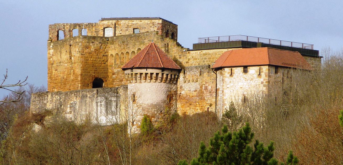 The castle was occupied by the French in 1648 during the Thirty Years’ War and in 1796 during the French Revolutionary Wars. They did not destroy it, but in 1865 the castle was ruined by a fire caused by lightning. The ruin has been an outstanding sight on the Staufer road since 1977. Up until 1986, the castle was owned by the noble family. At that time it was sold to a private citizen in Göppingen. The irregular, polygonal castle complex has a ring wall with humpback blocks, a Hohenstaufen palaces next to the rectangular projecting gate and a 30-meter-deep castle well. The castle chapel has not been used since 1806. (Walter Ziegler: Stauferstatten im Stauferland, Walter Ziegler (Ed.), Konrad Theiss Verlag, 1977)