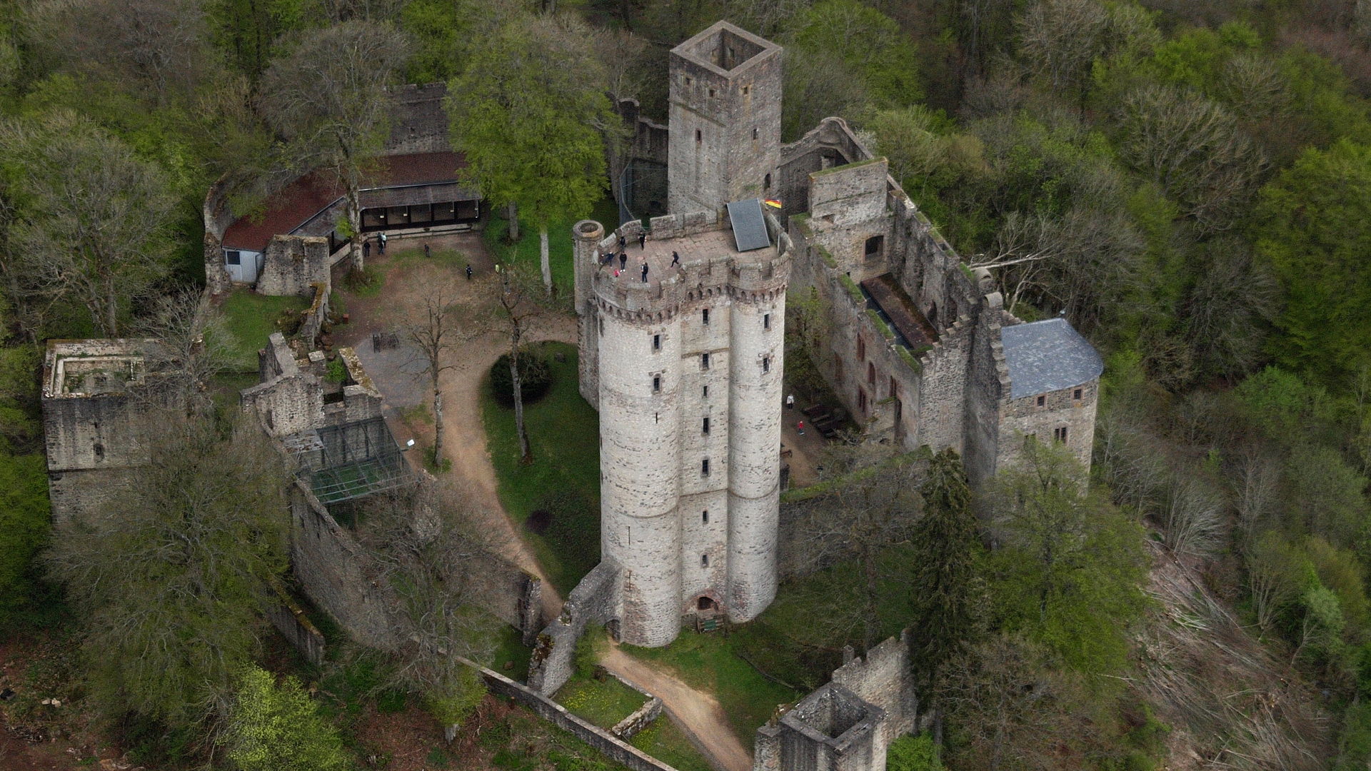 The double tower is open to the public and has a good view of the surrounding area but, despite its size, is not a bergfried (fighting tower). The latter, built around 1200, is smaller and stands in the eastern part of the inner bailey. It has a square ground plan and was turned into a tower house in the 14th century. A nearly 33-metre-long palas, which dates to the 14th century is part of the inner court. The castle was built in the 12th century. Its owners may have been the lords of Castel, but this is not entirely certain. The castle was first mentioned in 1291 as the Castilburg. In 1314, it is called Castelberch.