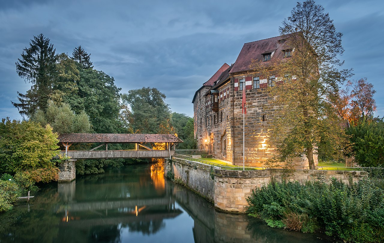 Lauf an der Pegnitz: Burg Lauf (Wenzelschloss), was originally a medieval fortress in the town of Lauf an der Pegnitz near Nürnberg. The German name Wenzelschloss (“Saint Wenceslas’ Chateau”) is derived from the statue of Saint Wenceslas, on the facade of the entrance gate. The castle was built by the Holy Roman Emperor, Charles IV in 1356, on the ruins of an older castle. The dominant feature of the castle is the hall of arms. In 1934, under a layer of old paint 112 coats of arms of noblemen of the Crown of Bohemia were discovered. It is a significant collection of Bohemian, Moravian and Silesian secular and ecclesiastical heraldry.