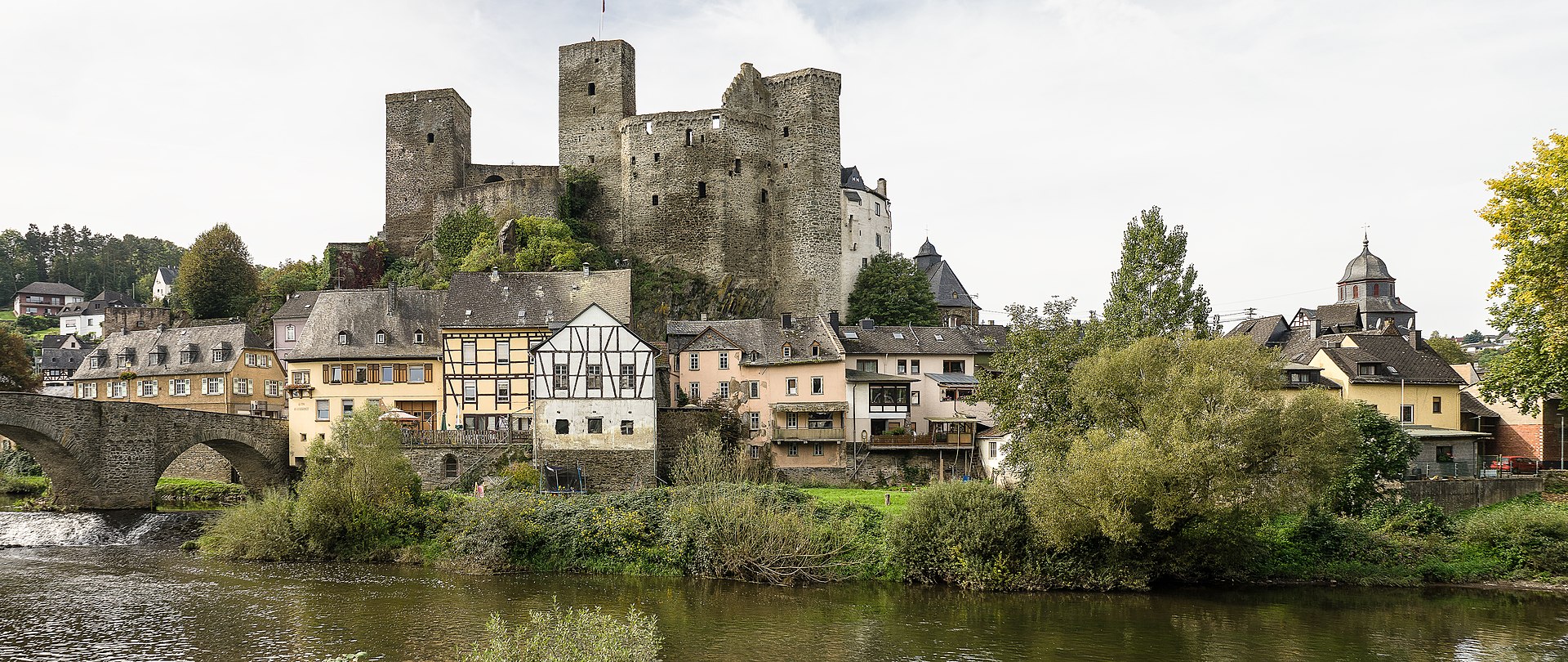 Runkel: Burg Runkel is a ruined hill castle dating from the High Middle Ages, located in the city of Runkel in the Landkreis (District) of Limburg-Weilburg in the state of Hesse. Nestled in the valley of the Lahn River, the town and castle are, i 3.75 mi (6.04 km) east of Limburg an der Lahn, 18.6 mi (29.9 km). The hill fort is situated at 492 ft (150 m) above sea level and rises about 115 ft (35 m) to 131 ft (40 m) above the valley of the Lahn.