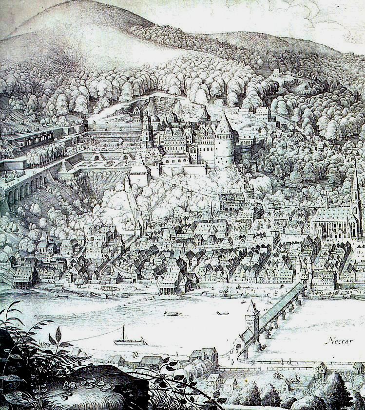 Schloss Heidelberg on the Neckar River showing the Alte Bruecke (Old Bridge), Heilgigeistkirche (Church of the Holy Ghost), from a 1643 engraving by Matthäus Merian. After the death of Charles II, Elector Palatine, Louis XIV of France demanded the surrender of the allodial title in favour of the Duchess of Orléans, Elizabeth Charlotte, Princess Palatine, who he claimed was the rightful heir to the Simmern lands. On 29 September 1688, the French troops marched into the Palatinate of the Rhine and on 24 October moved into Heidelberg, which had been deserted by Philipp Wilhelm, the new Elector Palatine. At war against the allied European powers, France’s war council decided to destroy all fortifications and to lay waste to the Palatinate (Brûlez le Palatinat!), in order to prevent an enemy attack from this area. As the French withdrew from the castle on 2 March 1689, they set fire to it and blew the front off the Fat Tower. Portions of the town were also burned, but the mercy of a French general, René de Froulay de Tessé, who told the townspeople to set small fires in their homes to create smoke and the illusion of burning prevented wider destruction.