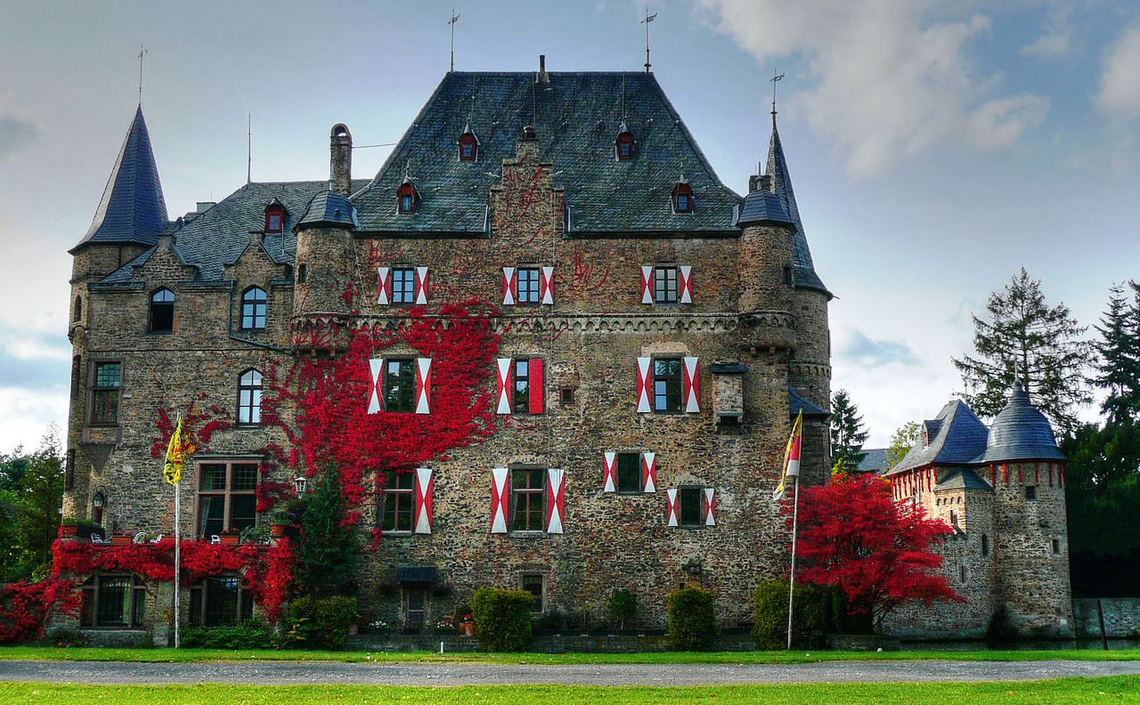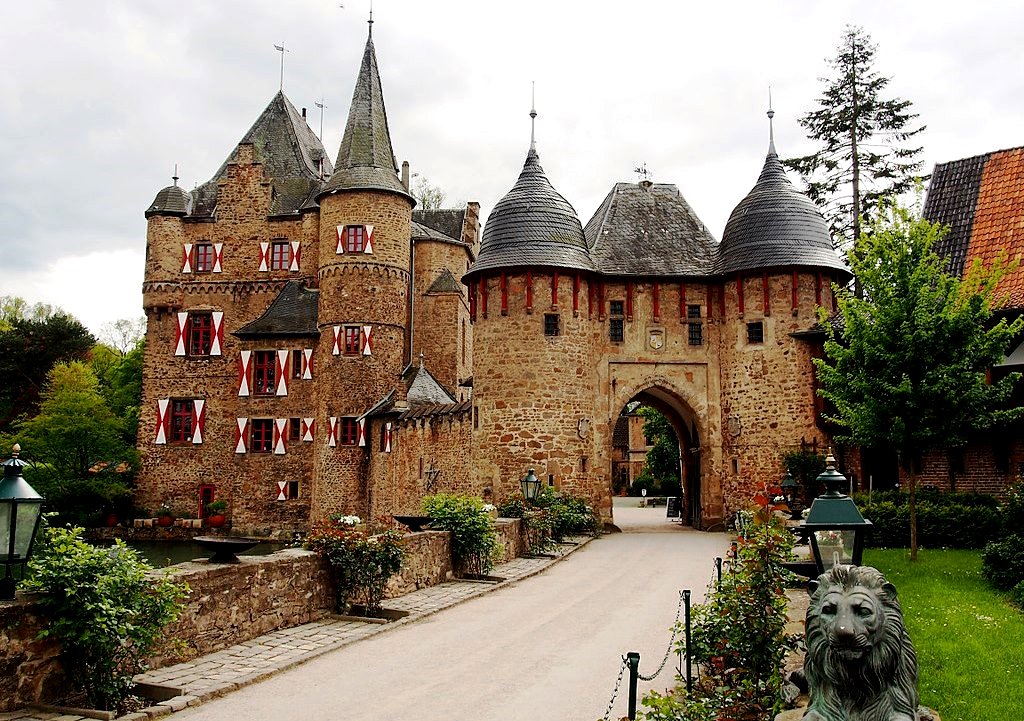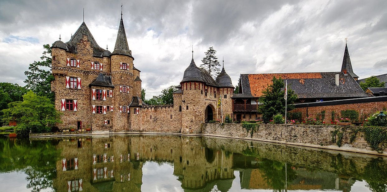 Mechernich: Burg Satzvey is a medieval moated castle, originally built in the 12th century, located on the northeastern edge of the Eifel in Mechernich (district Satzvey) in Euskirchen, North Rhine-Westphalia. It is one of the best preserved moated castles in the Rhineland, retaining much of its original Rhenish structure. It was built by the ministerial nobility of the 14th and 15th centuries in the lowland (high nobility tended to build hilltop castles that were difficult to conquer). Without mountains to build on as a natural obstacle for attackers, lowland castle builders had to rely on moats and water ditches that were difficult to overcome. For this reason, moated castles were usually built on two islands and were almost always near a stream that supplied the trenches with water. The more strongly fortified main castle was thereby additionally protected by an outer castle built on a second island.
