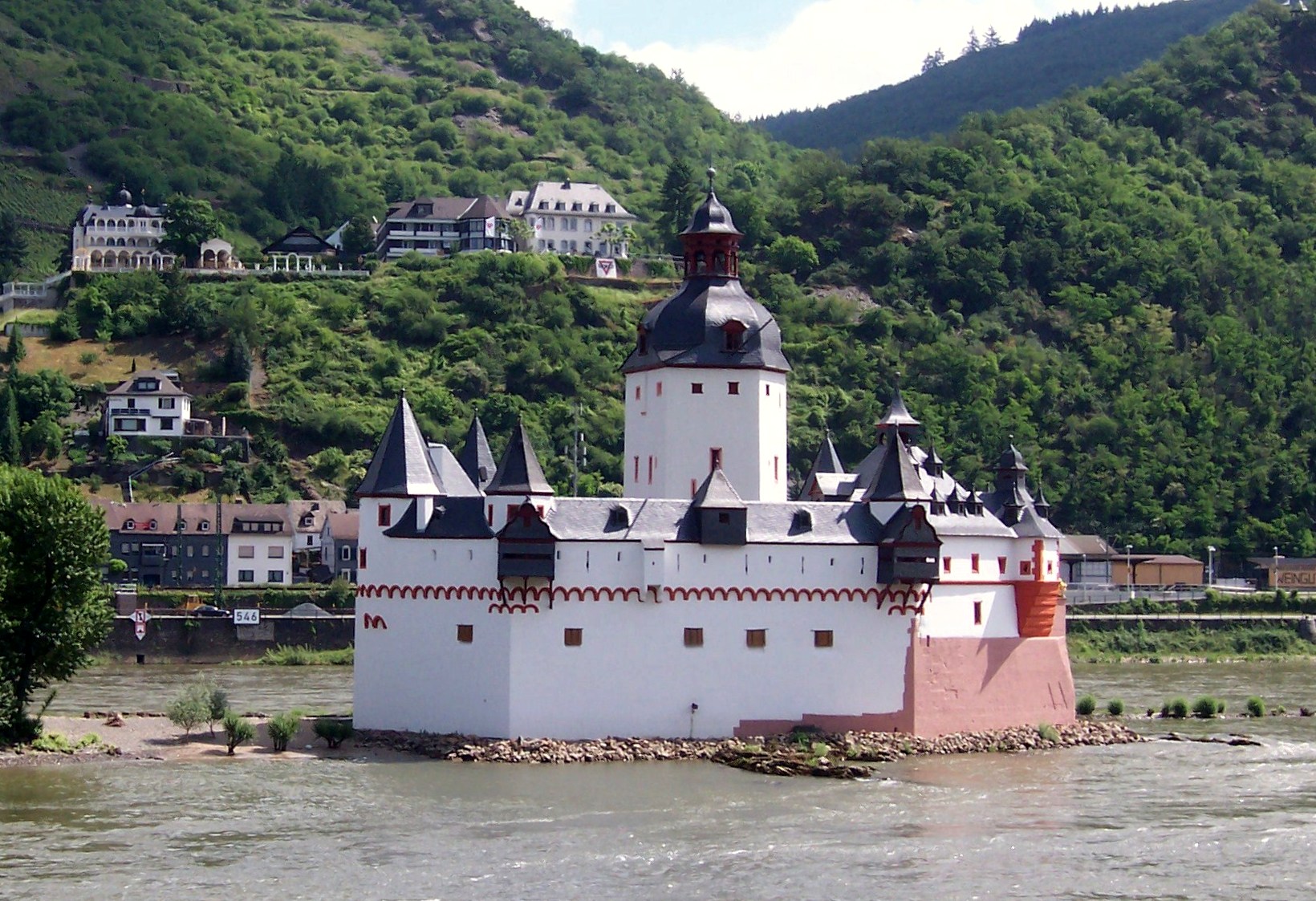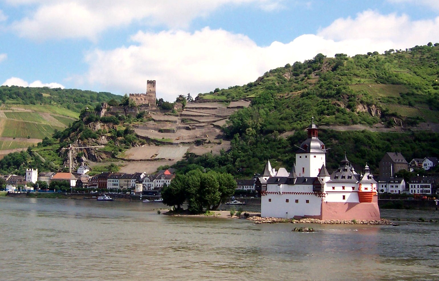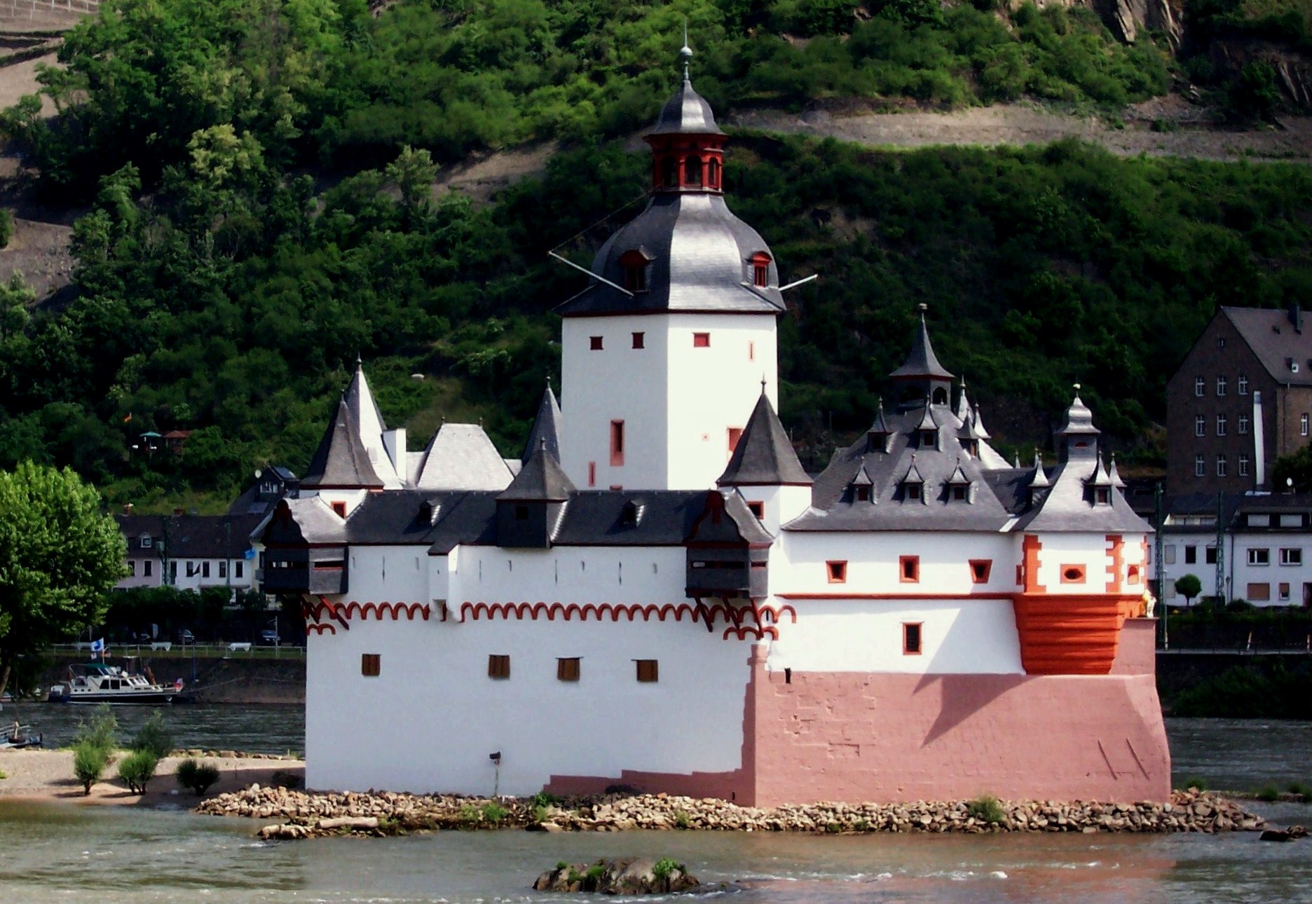 Kaub: Burg Pfalzgrafenstein is a toll castle on Falkenau island, otherwise known as Pfalz Island in the Rhine River near Kaub, Germany. Known as “the Pfalz,” this former stronghold is famous for its picturesque and unique setting. The keep of this island castle, a pentagonal tower with its point upstream, was erected 1326 to 1327 by King Ludwig the Bavarian. Around the tower, a defensive hexagonal wall was built between 1338 to 1340. In 1477 Pfalzgrafenstein was passed as deposit to the Count of Katzenelnbogen. Later additions were made in 1607 and 1755, consisting of corner turrets, the gun bastion pointing upstream, and the characteristic baroque tower cap.The castle functioned as a toll-collecting station that was not to be ignored. It worked in concert with Gutenfels Castle and the fortified town of Kaub on the right side of the river. Due to a dangerous cataract on the river’s left, about a kilometer upstream, every vessel would have to use the fairway nearer to the right bank, thus floating downstream between the mighty fortress on the vessel’s left and the town and castle on its right. A chain across the river drawn between those two fortifications forced ships to submit, and uncooperative traders could be kept in the dungeon until a ransom was delivered. The dungeon was a wooden float in the well. Unlike the vast majority of Rhine castles, “the Pfalz” was never conquered or destroyed, withstanding not only wars, but also the natural onslaughts of ice and floods by the river. Its Spartan quarters held about twenty men.