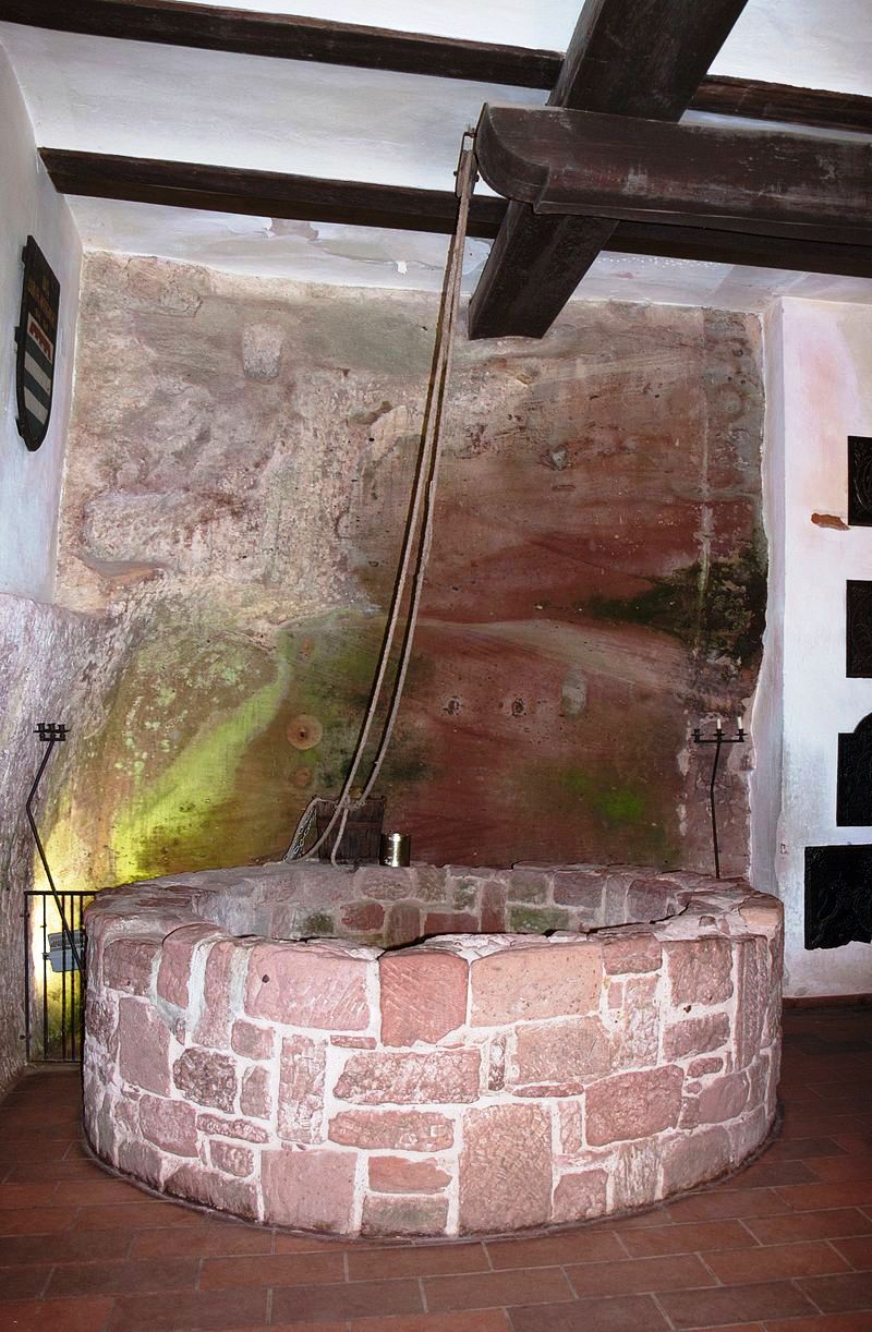 The extremely deep well is one of the castle builders’ greatest accomplishments. The well has a diameter of 2 metres (6 ft) and was hacked out of the rock to the bottom of the valley some 104 metres (341 feet) below. This was essential to the castle’s survival when under siege. The historic Great Hall or Rittersaal has a cross-vaulted ceiling. An engraving on the supporting central pillar shows that it dates to the 13th century. The south wall of the hall is made from rock and includes a hewn-out lift shaft used by the knights of Berwartstein to deliver supplies to the table and deliver food and drink from the kitchen above.