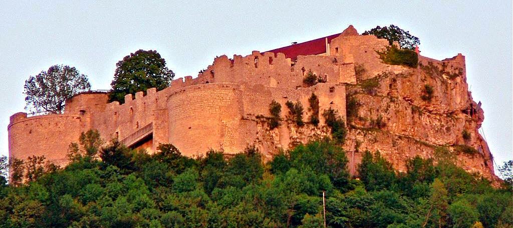 Neuffen: Burg Hohenneuffen is a large hill fort now in ruins, standing above the town of Neuffen in the district of Esslingen in Baden-Württemberg. The high medieval castle ruins are located east of Neuffen at 745.4 m above sea level on “fortress mountain”, a white Jurassic rock on the edge of the Swabian Alb. The castle guards a strategically favorable location on the Albantrauf. The Hohenneuffen was already settled in ancient times. In the late Celtic La Tène period (450 to 1 BC) it served as an outpost of the well-known Heidengraben -oppidum (Celtic fort c1 BC), which included the entire “Erkenbrechtsweiler peninsula” of the Swabian Alb. The origin of the name (1206 Niffen ) is controversial. On the one hand, it is traced back to a Celtic word * Nîpen and then interpreted as a ” battle castle “. Another etymology derives the name of the other hand Germanic * hnîpa meaning “steep slope, mountainside”.