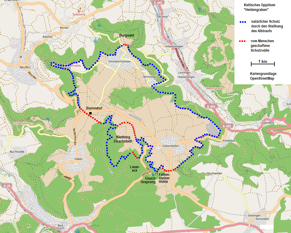 The Heidengraben, a Celtic oppidum (a fortified, urban-like settlement from the La Tène period – late Iron Age), that dates to the 1st century BC. It was located on the Swasbian Alb near Grabenstetten. The remains of the fortification of the oppidum are still visible as a rampart. The oppidum had an outer and an inner ring of fortifications, inside the latter was the settlement called Elsachstadt (after the Elsach brook, which rises below the oppidum in the Falkensteiner cave). The oppidum is located on the Grabenstetten peninsula , a part of the Alb plateau that is only connected to the rest of the Alb plateau by a narrow strip south of Grabenstetten, so that the Alb is a natural fortification. This location made it possible to enclose an area of around 16.6 km² by building four short fortifications. These fortifications separated the present day area of the municipality of Hülben, the Burgwald area between Beurener Fels and Brucker Fels , the connection to the rest of the Alb plateau and the Lauereck area bordering the inner fortification in the south. The Elsachstadt settlement had an area of 1.53 km² and was located west of the present day municipality of Grabenstetten.