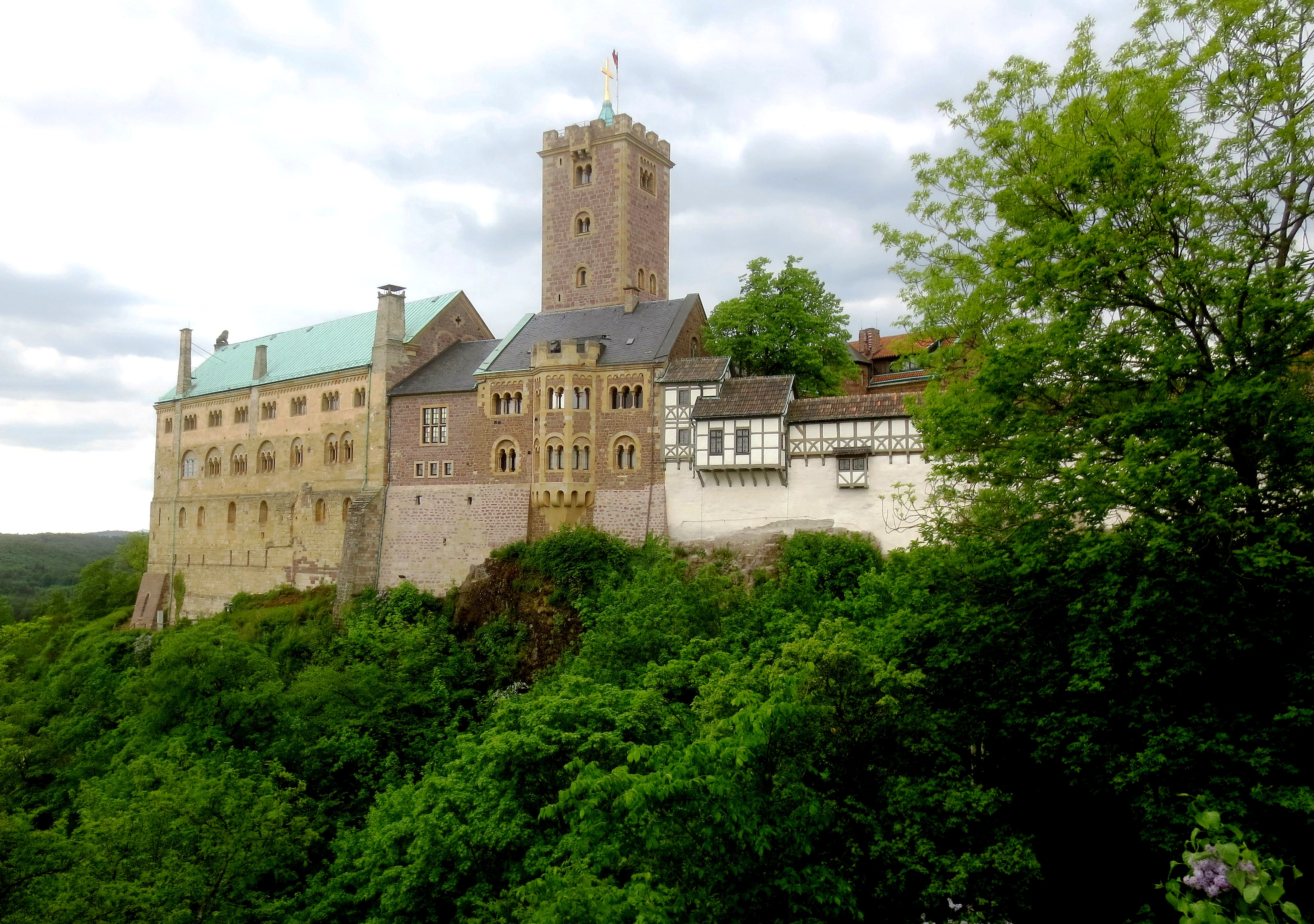 Eisenach: Wartburg Castle, overlooking the town of Eisenach in the state of Thuringia, Germany, 27 May 2016. Originally built in Middle Ages, The Wartburg stands on a cliff rising 410 meters (1,350 ft) to the southwest of and overlooking the town of Eisenach, in the state of Thuringia, Germany. It was the home of St. Elisabeth of Hungary, the place where Martin Luther translated the New Testament of the Bible into German, the site of the Wartburg festival of 1817 and the supposed setting for the possibly legendary Sängerkrieg. It was an important inspiration for Ludwig II when he decided to build Neuschwanstein Castle. The Wartburg castle contains substantial original structures from the 12th through 15th centuries, but much of the interior dates back only to the 19th century.
