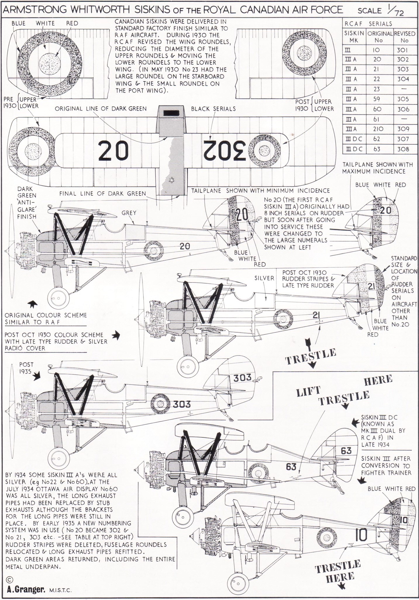 Armstrong Whitworth Siskin Mk. III (2), (Serial No. J7758), 10, (later 301), and (Serial No. J7759), Mk. IIIA (8), (Serial Nos. 20), (later 302), 21 (later 303), 22 (later 304), 23, 59 (later 305), 60 (later 306), 61, 210, (later 309), Mk. IIIDC dual control (2), (Serial Nos. 62), (later 307), and 63 (later 308), for a total of 12 aircraft.