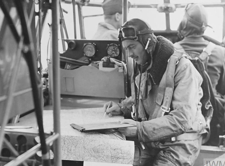 Original wartime caption: The Avro “Anson” is a general reconnaissance and advanced training machine of unusually roomy construction and good visibility. A low-wing cantilever monoplane, powered by two Armstrong-Siddeley “CHEETAH IX” engines each developing 310 h.p. The navigator of an Anson bomber checks his course.