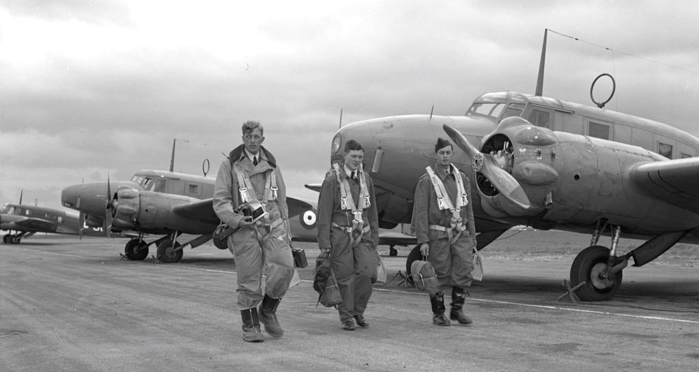Navigators In Training. A trio of Commonwealth airmen( L to R: J.A. Mahoud, RAF; E.M. Romilly, RCAF and W.H. Betts, RAAF).walk down a line of Avro Ansons to the aircraft which will carry them on a navigation training flight out of Rivers, Manitoba, on 4June 1941. From left to right, the airmen pictured here represent the air forces of Britain, Canada and Australia. They were being trained in Canada by the RCAF under the British Commonwealth Air Training Plan.