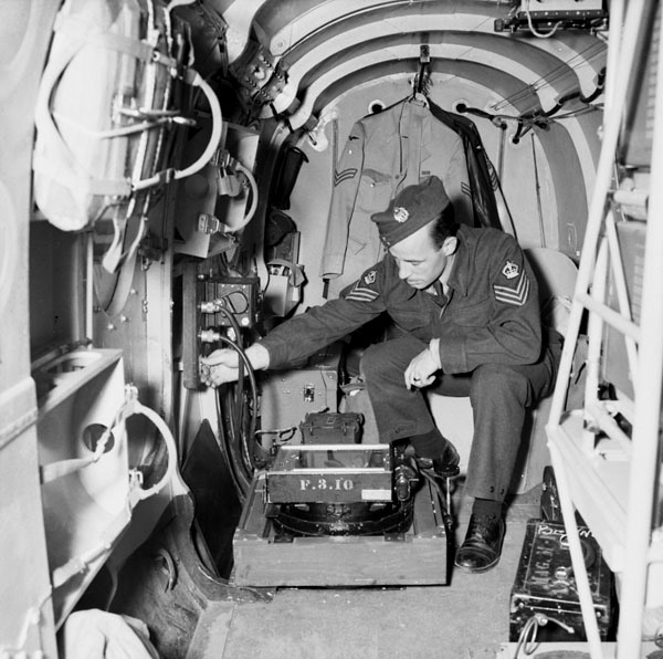 Sergeant, No. 14 (P) Squadron, RCAF, installing a vertical camera in an Avro Anson Mk. V, RCAF Station Rockcliffe, Ontario, 4 July 1944.