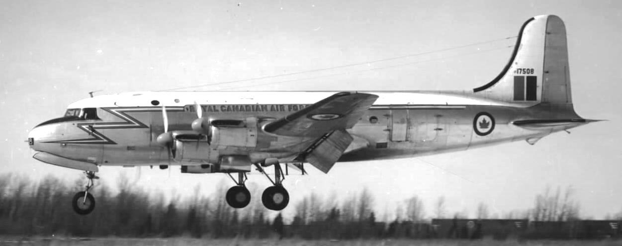 Canadair CL-2 (C-54GM) North Star, RCAF (Serial No. 17514). c/n 121.  Taken on strength 8 March 1948.  With No. 425 (T) Squadron.  To Greenland for Operation Re-supply in April 1952.  With No. 426 (T) Squadron at RCAF Stations Dorval, PQ and Trenton, Ontario.  Fitted briefly with belly radar installation in late 1950s.  Delivered nerve gas from Baltimore, USA to Suffield, Alberta, June 1959.  Carried UN troops and supplies to Belgium Congo, in 1960. SOC 27 September 1956 – Free issue to National Research Council.  Later to civil register as CF-SVP-X. Operated by National Aeronautical Establishment with extensive magnetic survey gear.  Used to map earth’s magnetic field, and to develop anti-submarine detection gear.  Last airworthy North Star.  Last working flight on 8 May 1975, on behalf of the National Aeronautical Establishment.  Later to Crown Assets for disposal, offered for sale from November 1978.  Purchased by Aircraft Salvage of Dallas, Texas in February 1979.  Sold to Miami based company.  Operated in Caribbean until about 1980, Reg. No. N8022L.  Allegedly used in smuggling operations.  Scrapped early 1980s at Greater Inagua Island.  (rwrwalker.ca)
