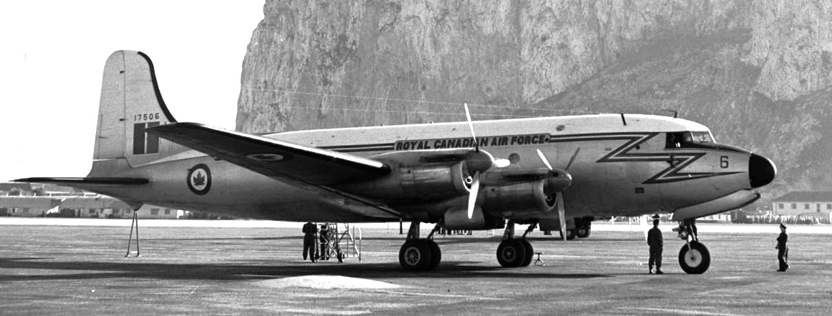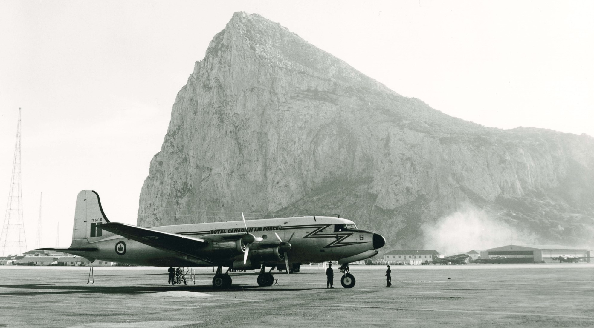 Canadair CL-2 North Star Mk. I (Serial No. 17506), from the RCAF’s Air Transport Command rests on the runway at Gibraltar.