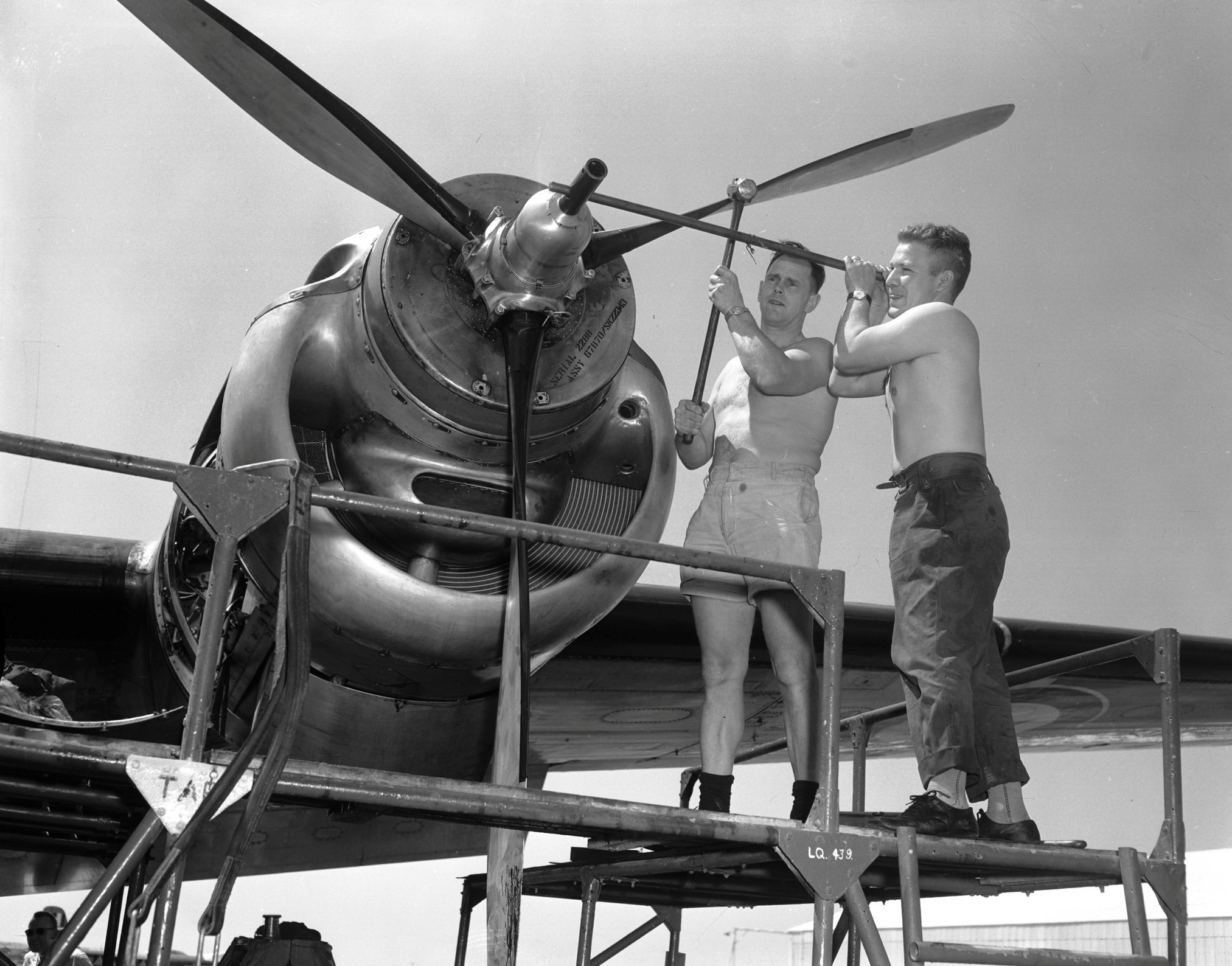 Two rigger-air frame technicians of No. 426 Squadron change an engine at Luqa Airport in Malta.  The North Star aircraft was on a trip to Australia when it was forced to stop over at Malta.  A spare engine was flown in from Langar.  (Rigger is slang for an Air Frame Technician and Fitter is slang for an Aero Engine Technician).