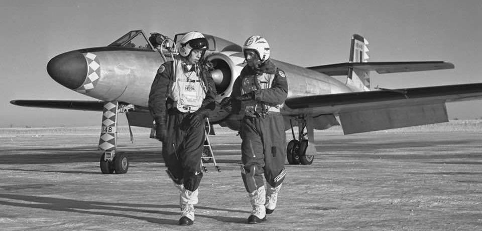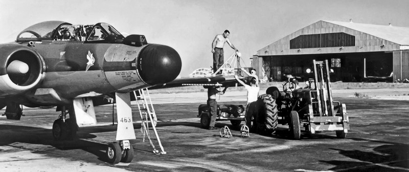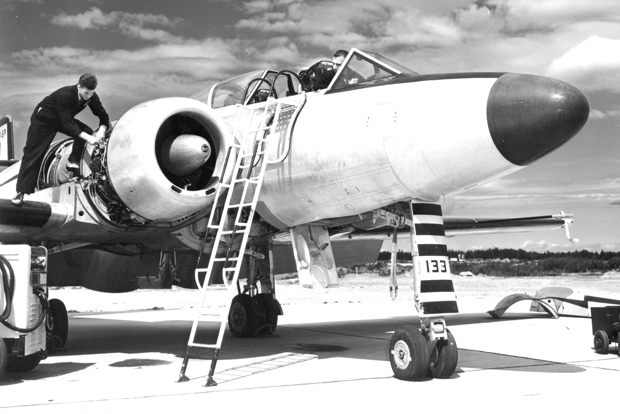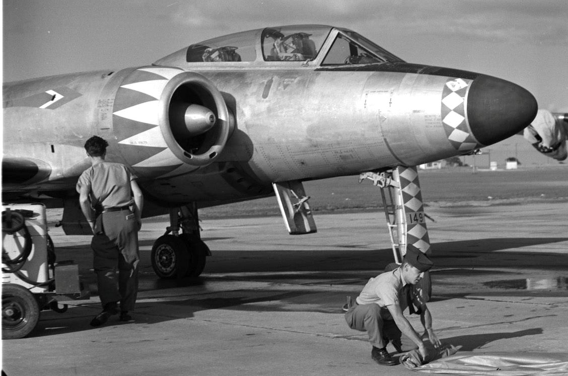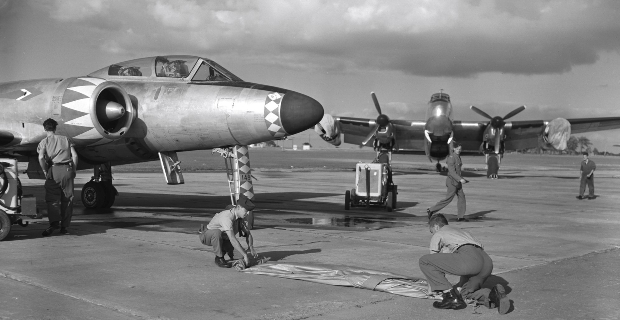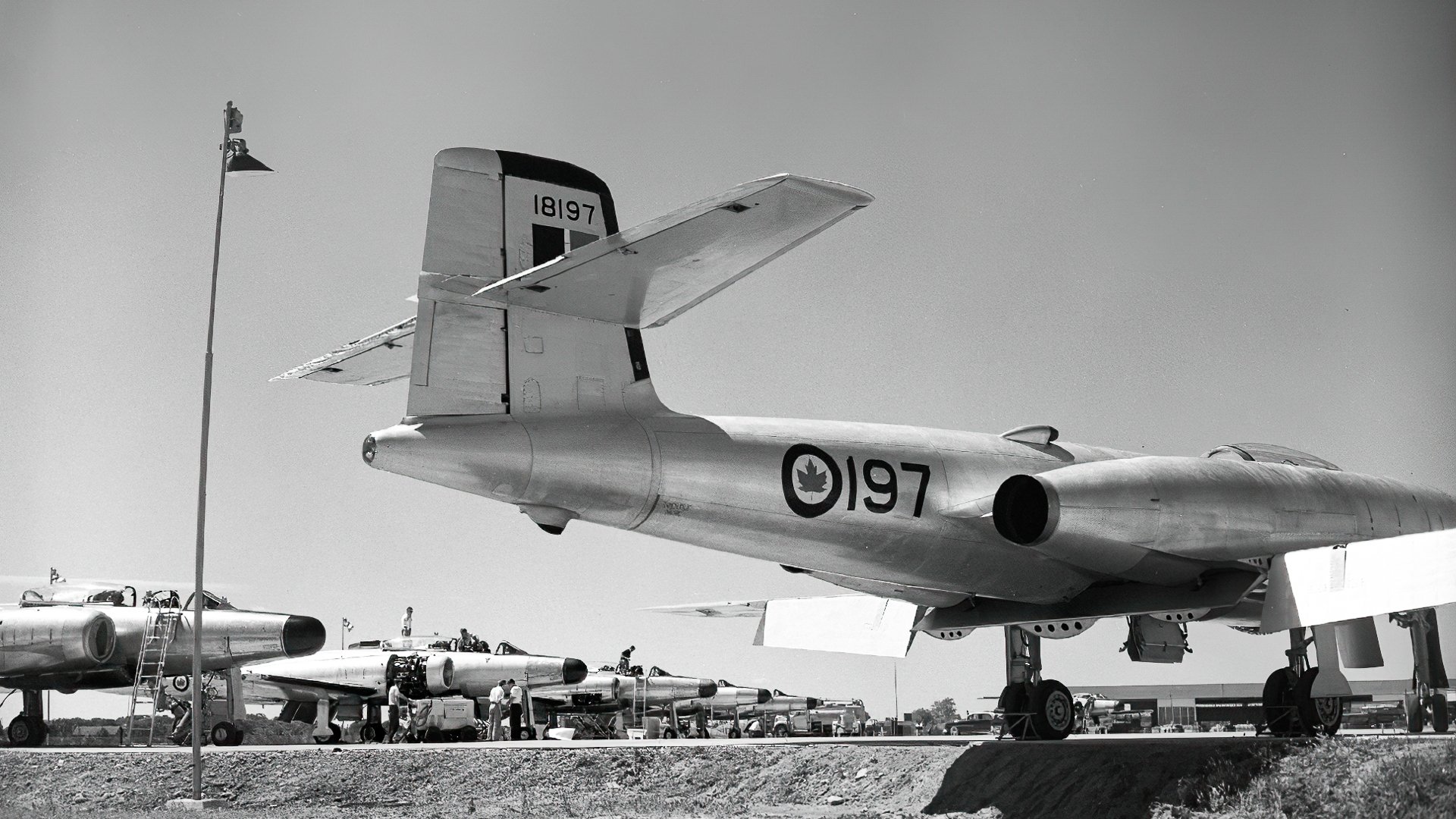 Avro CF-100 Canuck Mk. 3 (Serial No. 18149), No. 423 Squadron, one of the last Mk. 3s. it crashed on 27 Feb 1967. The crew ejected safely. In the background with covers over its outboard jet engines is RCAF Avro Lancaster (Serial No. FM 209) that was used as a jet engine test bed. It was converted by Avro Canada as a Mk. 10C test bed for two 3,000 pound thrust Avro Chinook TR.4 Mark II axial-flow turbojets in outer nacelles in 1951 and scrapped in 1956. The techs in the foreground are rolling up the canopy cover for 18149.