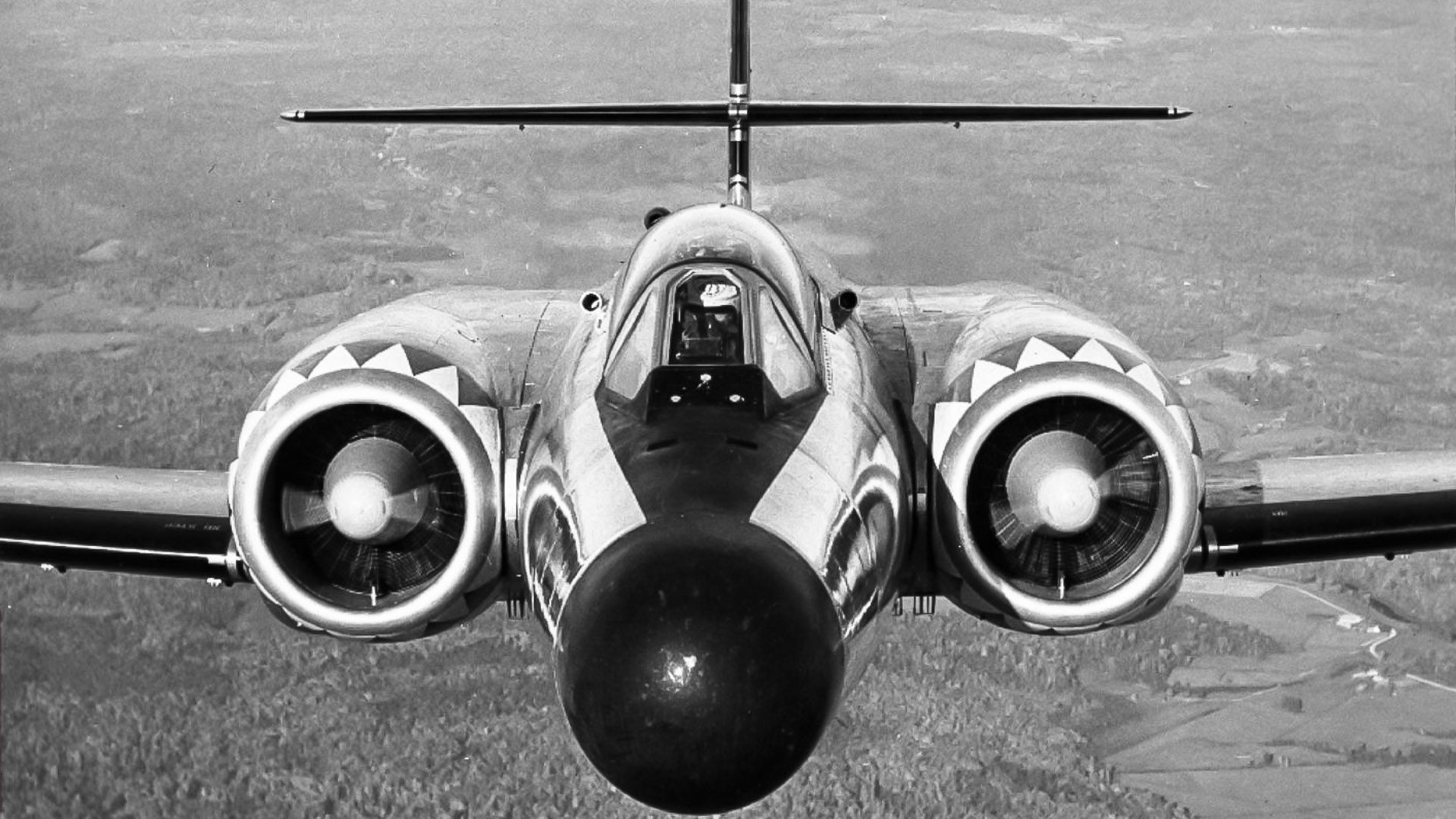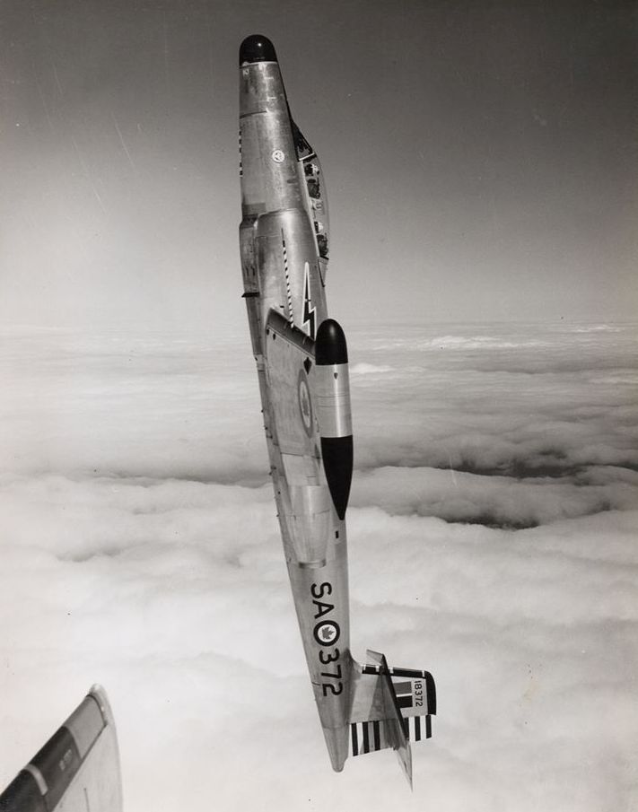 Avro CF-100 Canuck Mk. 4A, RCAF (Serial No. 18372), coded SA, No. 445 Squadron, in a vertical climb, over RCAF Station Uplands, Ontario in 1955. This CF-100 also flew with No. 423 and 440 Squadrons.