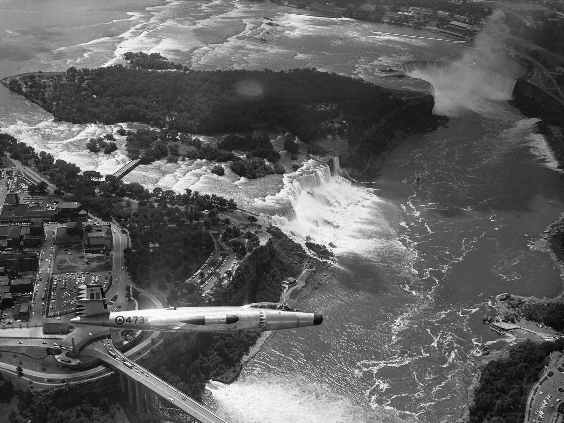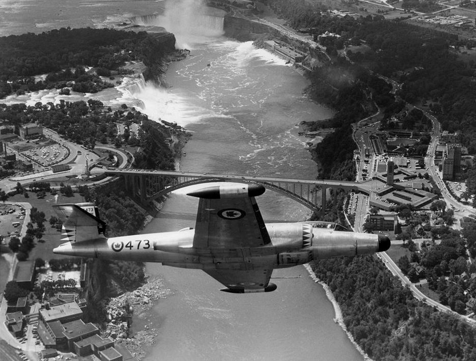 Avro CF-100 Canuck Mk. 5D, RCAF (Serial No. 18473), over Niagara Falls. No. 423 “Eagle” AW (F) Squadron based at RCAF Station St. Hubert, Quebec. Its crew was in Ontario participating in the Canadian National Exhibition’s International Air Show in August, 1956.