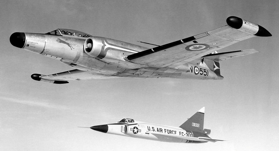 Avro CF-100 Canuck Mk. 5 (Serial No. 18551), coded AN, No. 410 Squadron, RCAF Station Uplands, Ontario, with a Convair F-102 Delta Dagger, USAF (Serial No. 56-1300), 10 Oct 1957. The CF-100 was flown by F/O Ed Wilkie when No. 410 Squadron was visiting Ernest Harmon AFB where the Americans were doing conversion training from F-89 Scorpions to the F-102 Delta Daggers.