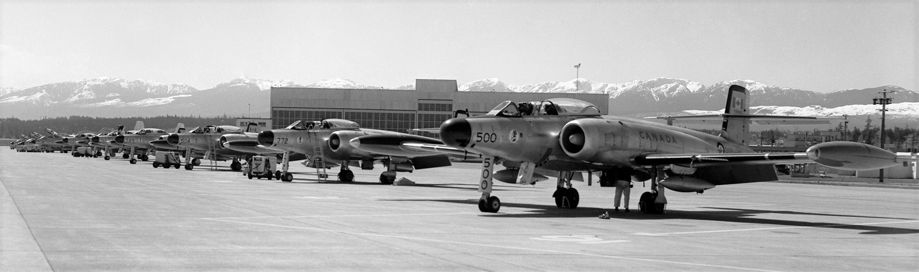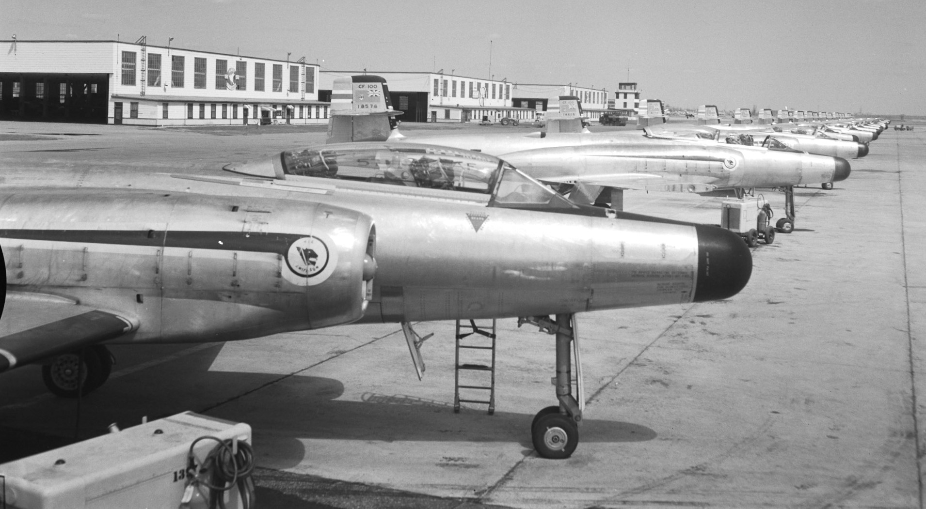 Avro CF-100 Canucks, No. 409 Squadron, lined up at CFB Comox, British Columbia.