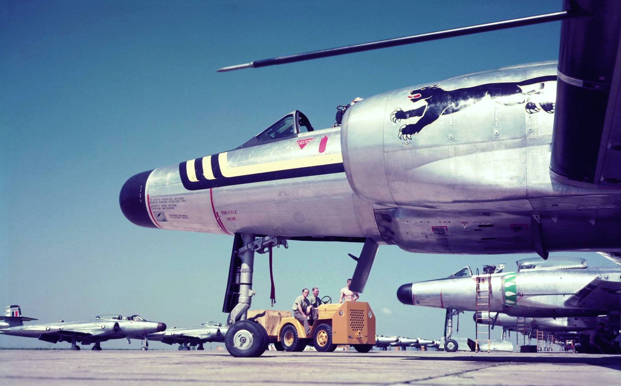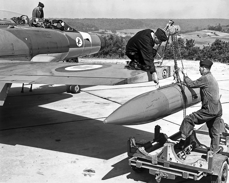 Avro CF-100 Canuck, No. 445 Squadron, with the starborad wing rocket pod being loaded at 1 (F) Wing, Marville, France, August 1958.