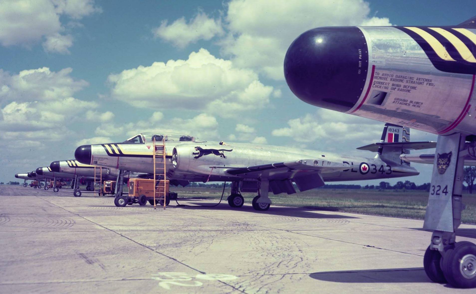 Avro CF-100 Canuck Mk. 5 (Serial No. 18343), coded DL, No. 432 Squadron, on the line at RCAF Station Hamilton, Ontario, in preparation for the fly-past at the Canadian International Air Show. Viewed from under another aircraft of No. 432 Black Cougar CF-100 Squadron from RCAF Station Bagotville, Quebec.
