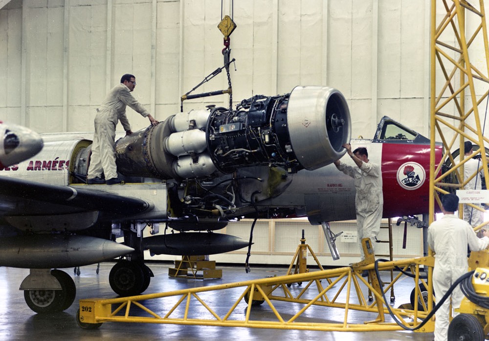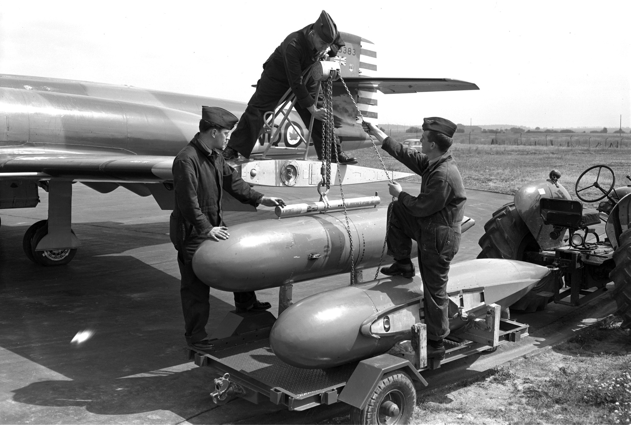 A rocket pod being installed on Avro CF-100 Canuck Mk. 4B, RCAF (Serial No. 18383), coded NQ, No. 423 Squadron, at 2 (F) Wing, RCAF Station Grostenquin, France in 1957. Note the winch apparatus that connects to the wing to winch the rocket pod up and down.