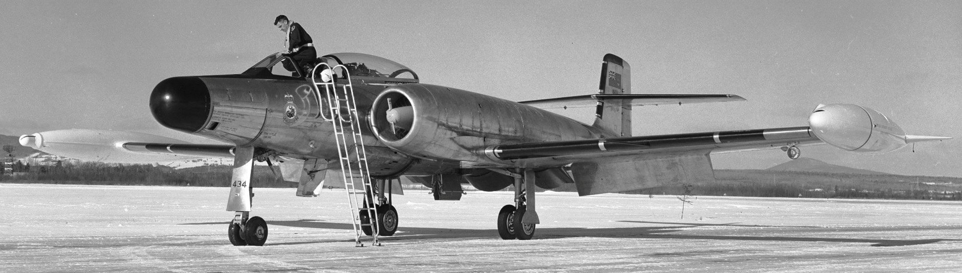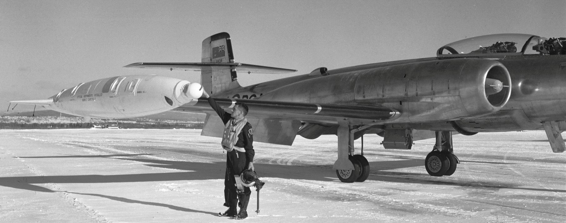 Avro CF-100 Canuck Mk. 4B (Serial No. 18434), No. 440 Squadron at RCAF Station Bagotville, Quebec, shown here at Ancienne Lorrette, Quebec, with specially modified white tip pods that contain IR detection equipment and cameras. This CF-100 is one of three aircraft being prepared at CARDE for operation “Lookout” which is to commence early in Jan 60 at Ascension Island. The “special” tanks are modified fuel tanks altered to contain automatic cameras and infra-red ray detection instruments. This equipment will be used for the detection and photographing of missile nose cones re-entering the atmosphere near Ascension Island. Three aircraft are being prepared, two to Ascension and one held in reserve. Atop the CF-100, preparing for a test flight, is F/L Jimmie Dyer, of CEPE CARDE who is to be the reserve CF pilot.