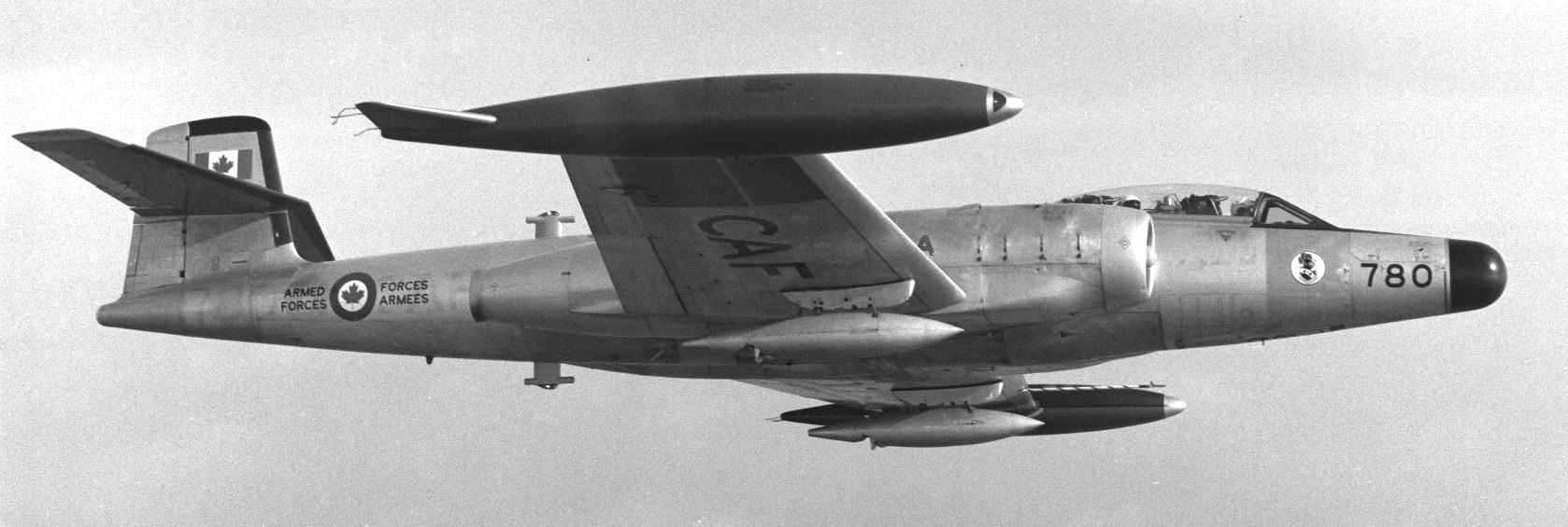 Avro CF-100 Canuck Mk. 5 (Serial No. 18780), (Serial No. 100780), No. 414 Squadron. With Electronic Warfare Unit at RCAF Station St. Hubert, Quebec in the 1960s. Still with this unit when it became No. 414 (EW) Squadron. Became instructional airframe A 780.