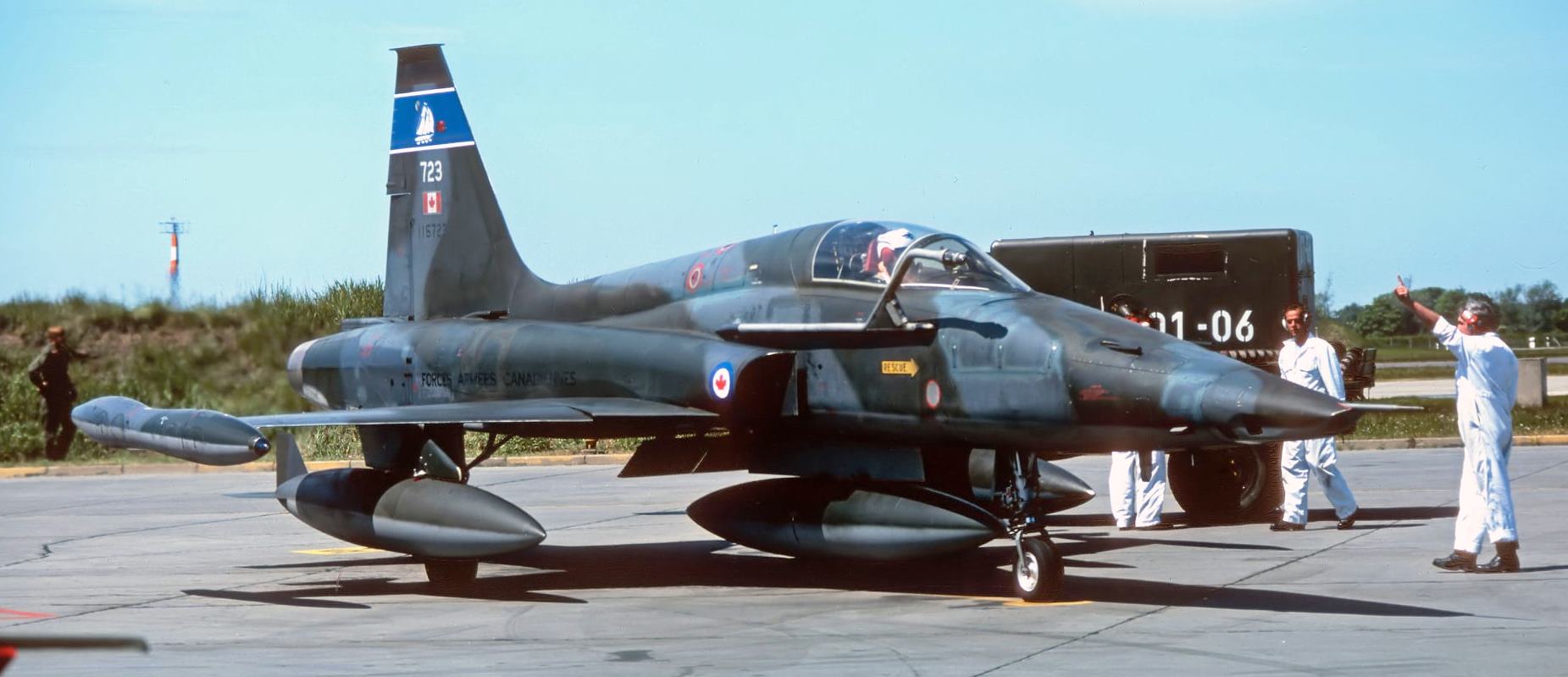 Originally ordered as RCAF 14723, re-marked before completion. Delivered direct to CFB Cold Lake, Alta. Served with No. 419 Squadron, CFB Cold Lake, Alberta. With No. 434 Squadron in 1980 when it visited Eggebeck, Germany, and in 1990. Received full Avionic Update Program modifications in early 1990s. Operational with No. 419 Squadron at Cold Lake in February 1995, one of the last operational CF-5s. In storage at CFB Trenton by June 1995. Stored at CFD Mountain View by June 1997. Delivered to Botswana c.2000 by Bristol Aerospace, part of a second batch of aircraft for this country. Their serial OJ11.