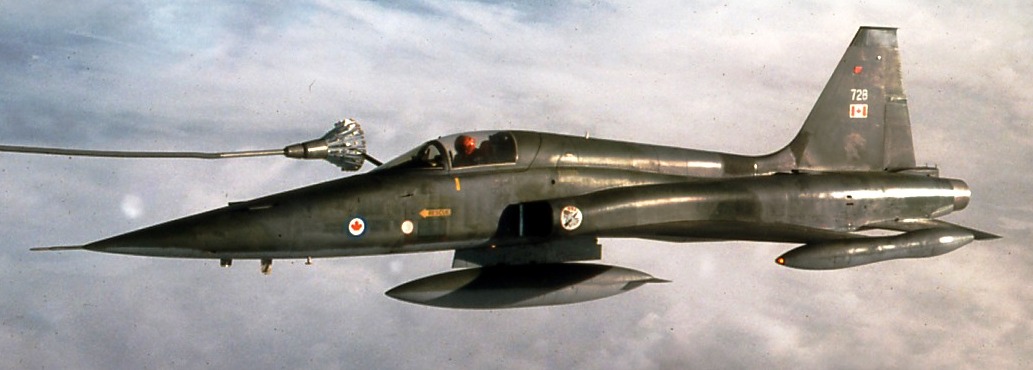 Canadair CF-116 Freedom Fighter (Serial No. 116728), No. 433 Squadron (ETAC), refueling from Boeing 707, ca 1978-79.