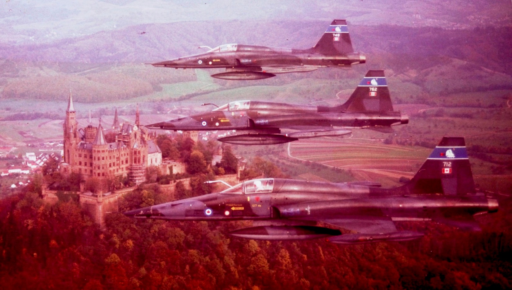 Canadair CF-116 Freedom Fighters (Serial Nos. 116712, 116762 and 116749), No. 434 Squadron over Schloss Hohenzollern, Germany, ca 1985.