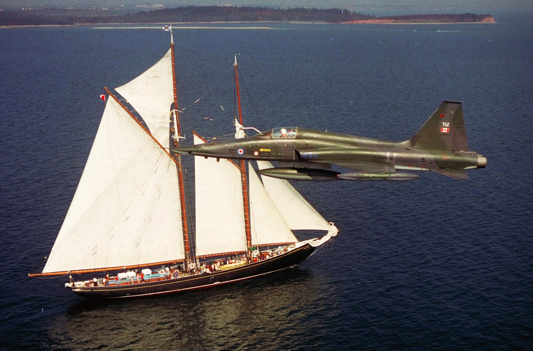 Canadair CF-116 Freedom Fighters (Serial No. 116712) flying over the Bluenose II, Nova Scotia.