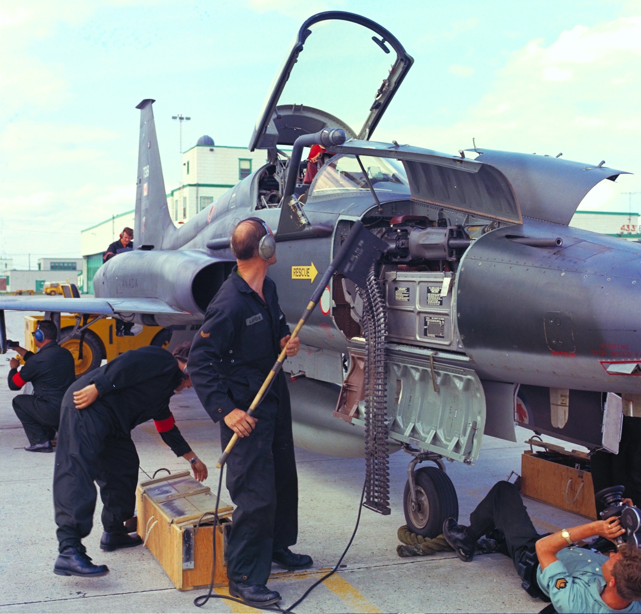 Canadair CF-116 Freedom Fighter (Serial No. 116738), CFB Bagotville, Quebec, 1975. There is a lot going on in this photo. The photo caption states “Combat Turn Around”. Cpl Yvon Lavoie, the closest technician standing, has the static wand in his hands used to sweep the windscreen before the pilot touches the windscreen when standing up. The static charge that built up on the windscreen was 40,000 volts but very low amps. I’ve seen a few guys jump when they were holding the grounding wire while the person swept the windshield lol. The pilot is already out of the cockpit so I am not sure why he has it in his hands unless he is sweeping the gun to disperse any static electricity.. There photo tech lying on his back filming under the nose. The gun is being reloaded, by another tech, and on the tail is a Safety Systems tech reloading the drag chute. Another tech is preparing the wing pylon for another load. (Mike Kaehler)