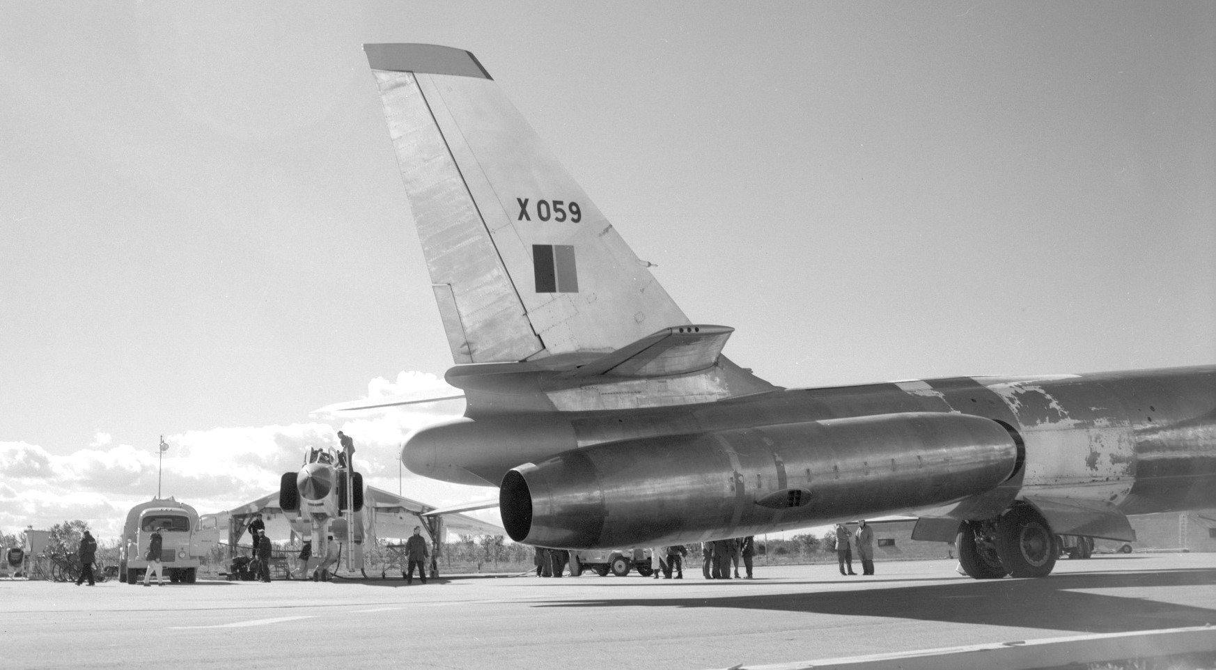 The only US Boeing B-47 Stratojet to be used by a foreign military was the RCAF (1956-1959). Designated the Canadair CL-52 B-47B 51-2059flew with registration X059 in Canada to test the Orenda Iroquois engine for the Avro Arrow. One of the Arrows is in the background. The airframe was heavily modified by Canadair so it was given a Canadair designation.