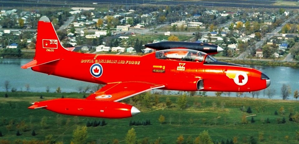 Canadair CT-133 Silver Star Mk. 3, RCAF (Serial No. 21057), Red Knight, coded RK, over Saskatoon, Saskatchewan. This aircraft crashed on 21 Aug 1963 killing the pilot F/L James Wilfrid Morin while performing a Cuban 8 maneuver at Gimli.