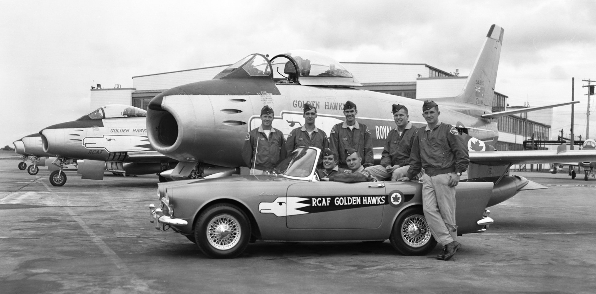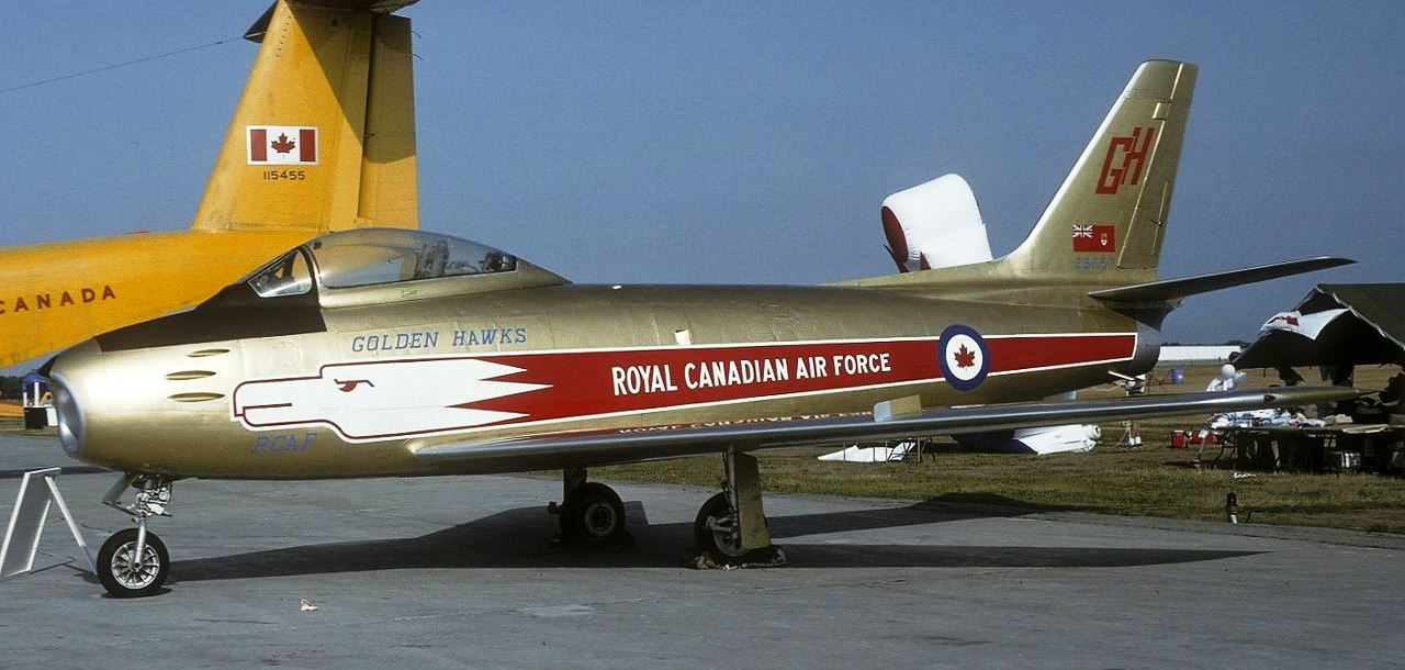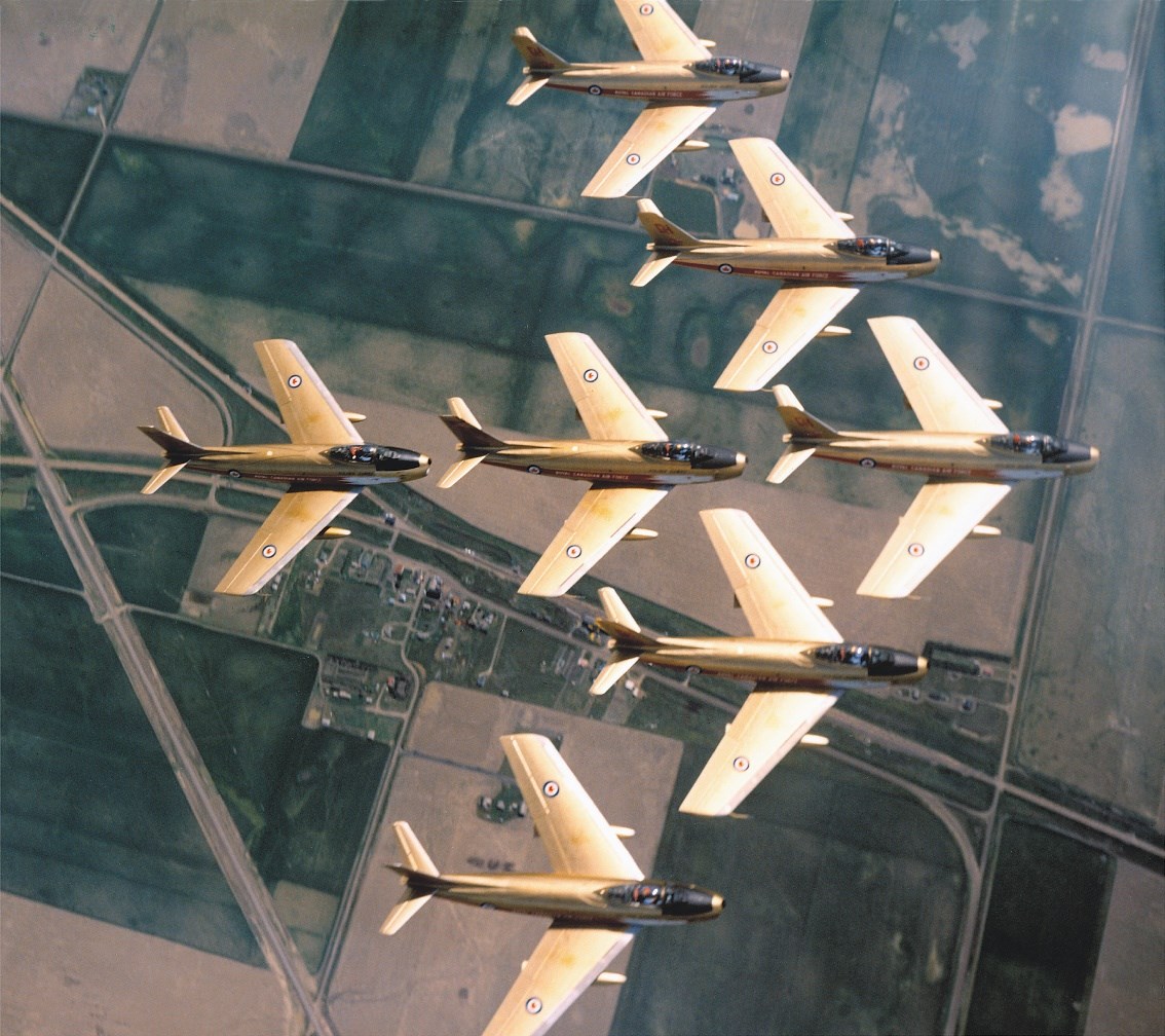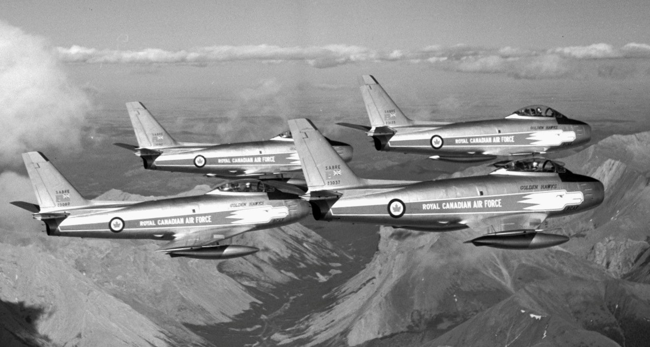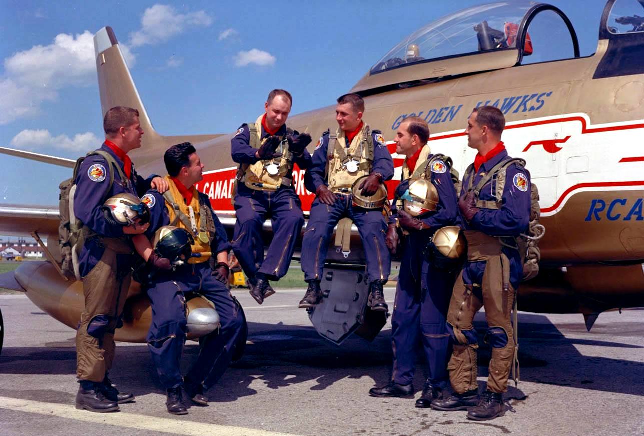 The Golden Hawks were an RCAF aerobatic flying team established in 1959 to celebrate the 35th anniversary of the RCAF and the “Golden” 50th anniversary of Canadian flight, which began with the AEA Silver Dart in 1909.