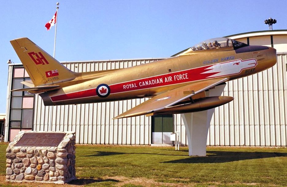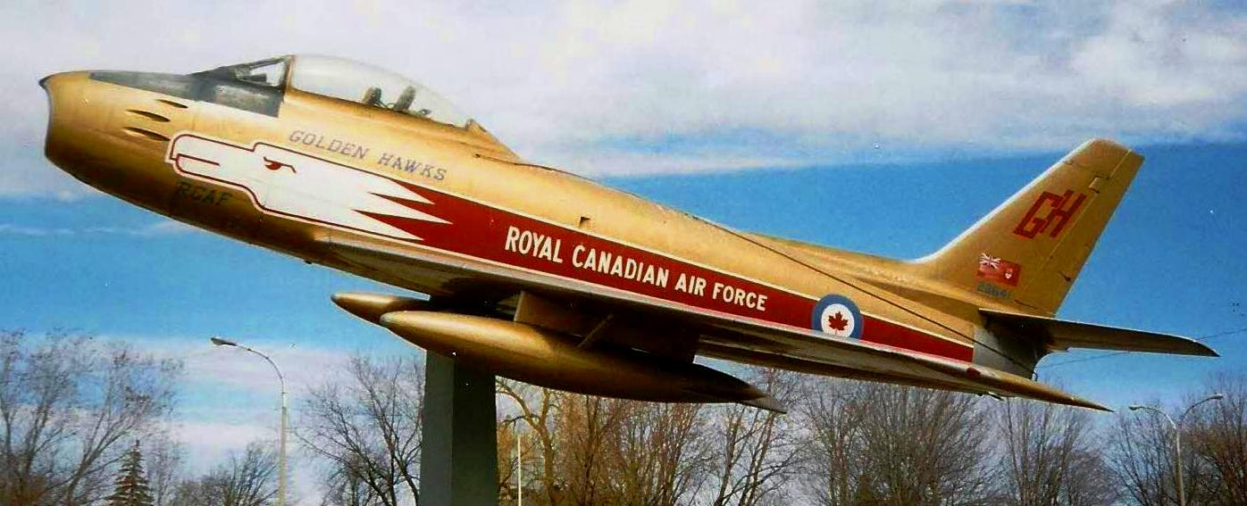 Canadair F-86 Sabre Mk. 5 (Serial No. 23355), Golden Hawks, dedicated in 1986 as a gate guardian at the former CFB Chatham, New Brunswick.  This aircraft is now with the Atlantic Canada Aviation Museum, Goffs, Nova Scotia.
