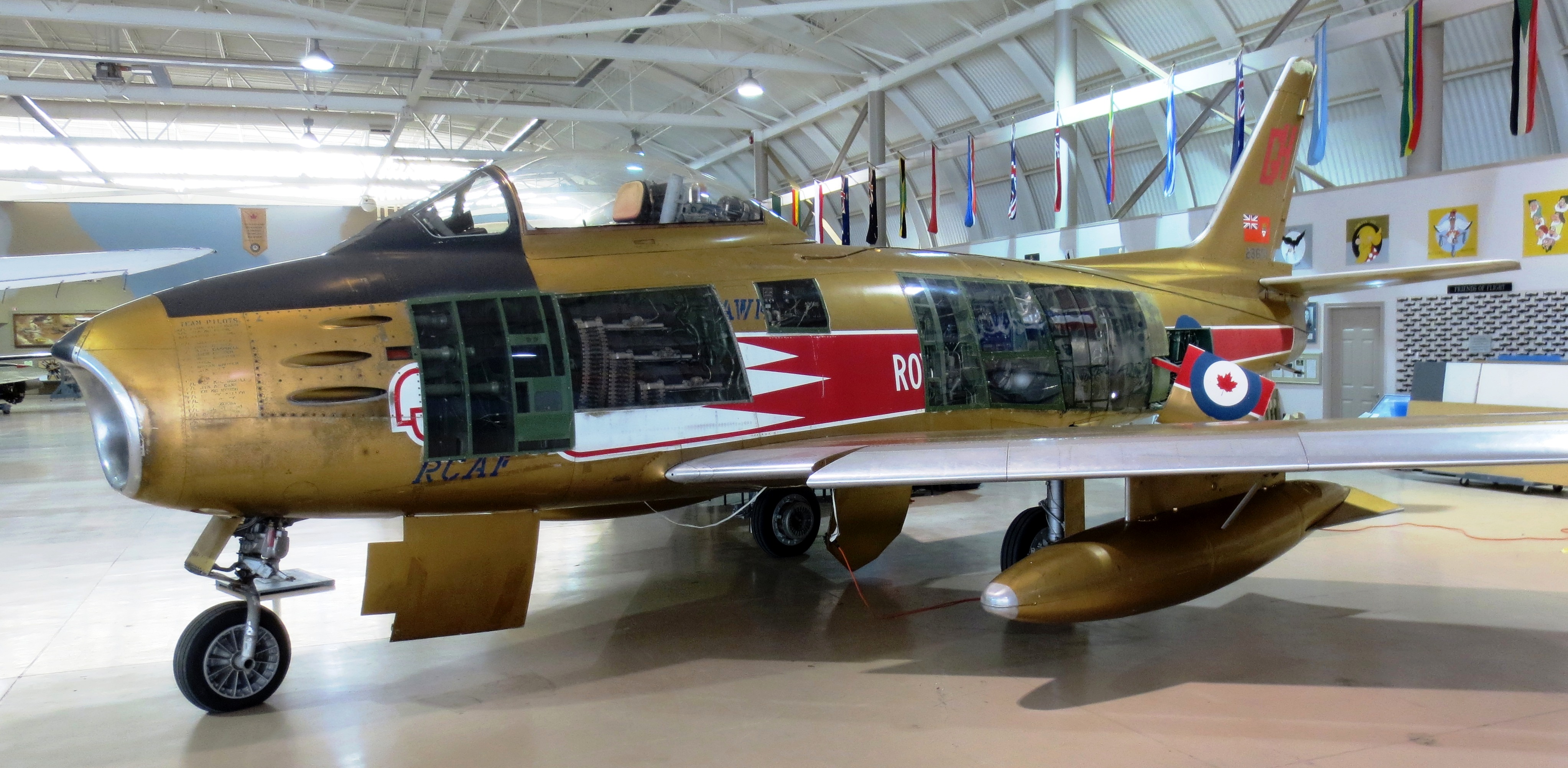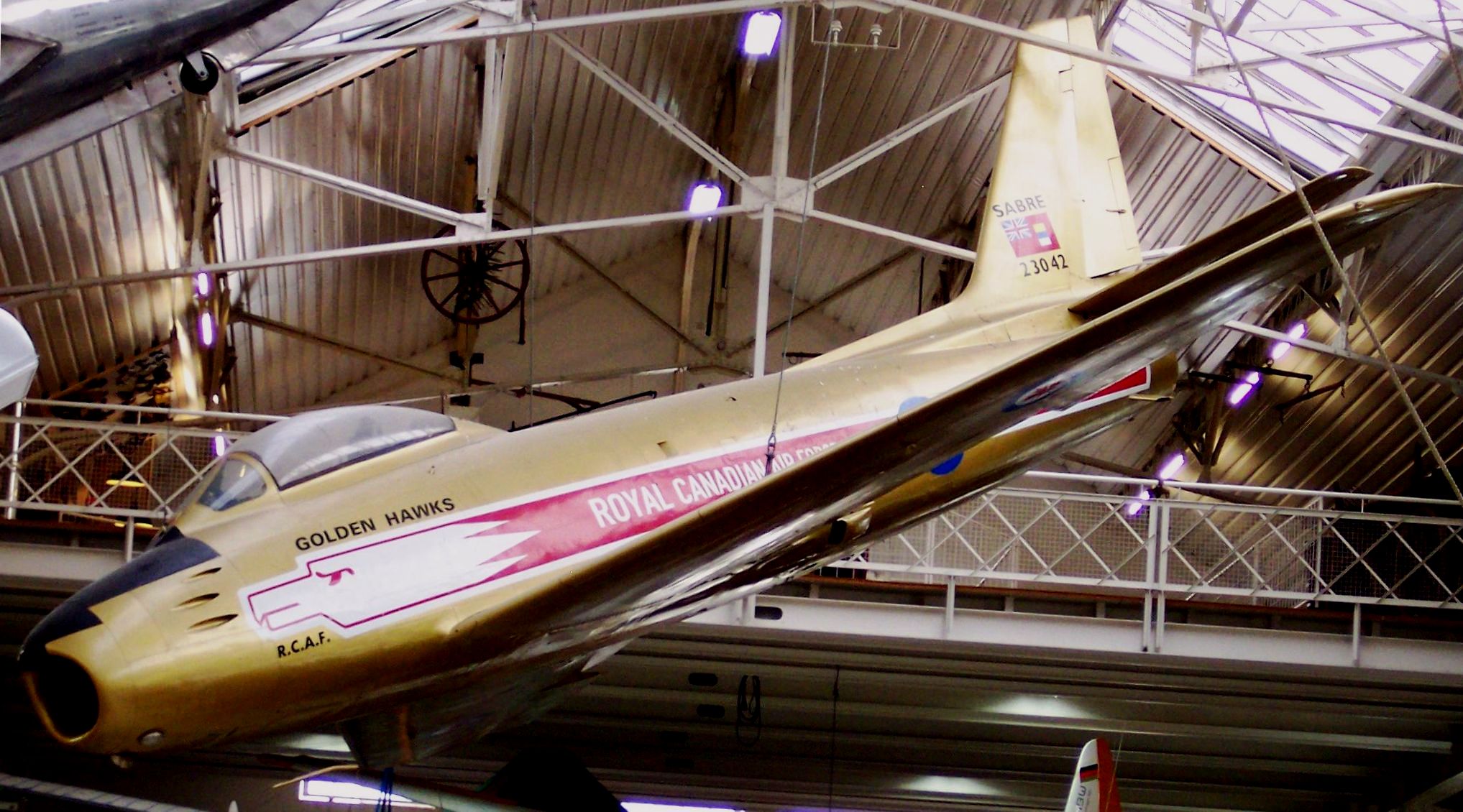Canadair F-86 Sabre Mk. 5 (Serial No. 23651), Golden Hawks, on loan from the National Museum of Science and Technology since 25 July 1998, to the Canadian Warplane Heritage Museum, Mount Hope, Ontario.  This aircraft is on display indoors with plexiglas panels on the port side.