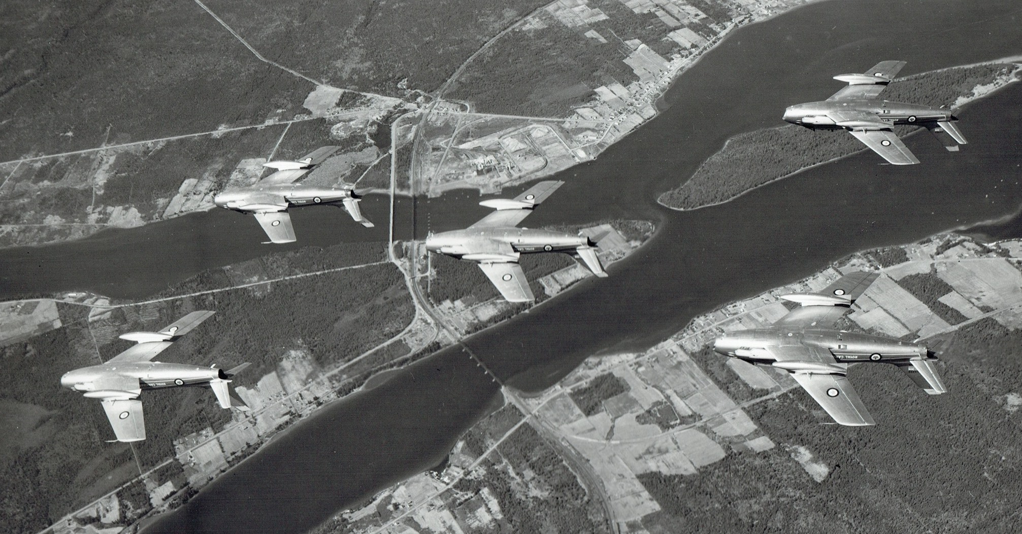 Canadair F-86 Sabres, Golden Hawks 5-plane formation over the Northwest and Southwest Miramich Rivers, New Brunswick.